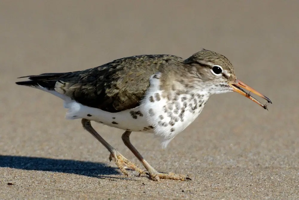The spotted sandpiper probes for a variety of insects and other small invertebrates, including fly larvae, grasshoppers, beetles, crickets, spiders, worms, crustaceans, and mollusks. It also catches insects in the air.