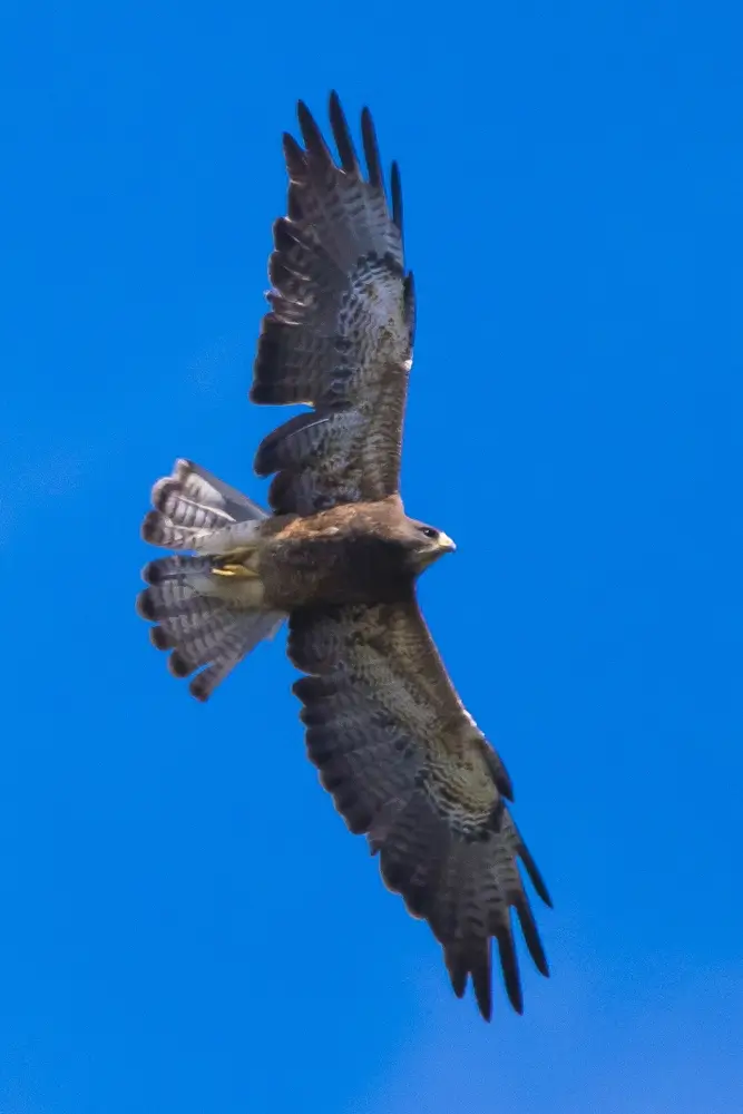 Swainson’s hawk is a large hawk. It is 18.9–22.1 inches (48-56 cm) in length with a wingspan of 4 to 4.5 feet (1.2-1.4 m).