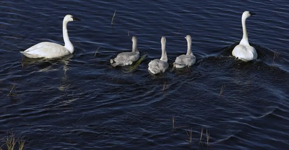 Both parents care for the cygnets, who are precocial and can swim and feed themselves shortly after birth, but still need to be brooded, or sat on by a parent to keep warm on the cold tundra. The cygnets migrate with their parents in the fall and stay with them through the winter. Male and female pairs usually mate for life.