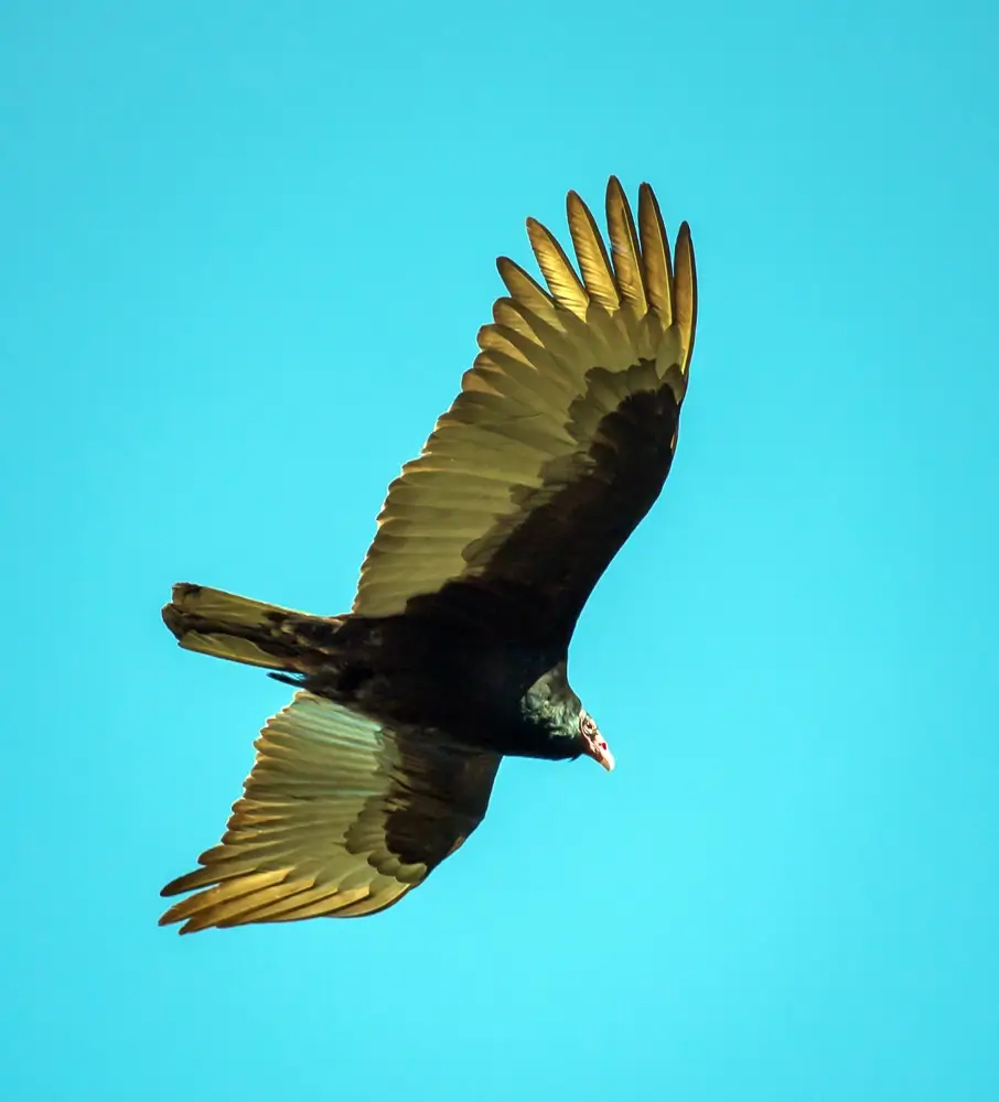 As it flies, it rocks from side to side instead of flapping its wings. This saves energy and allows the turkey vulture to stay in the air longer. It also glides on thermals or updrafts of air.