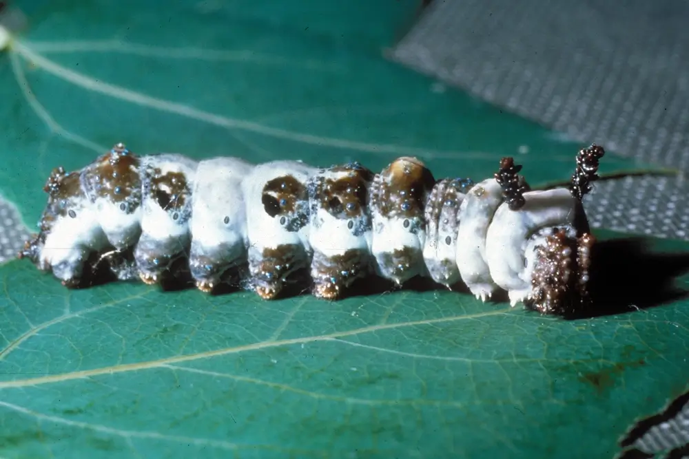 It has a wingspan of 2.5-3.5 inches (6.4-8.9 cm). It is dark orange with black veins. A row of white spots edges its wings. Its color and pattern mimic the monarch butterfly’s pattern, except for a black horizontal stripe that crosses the bottom of its back wings. The viceroy caterpillar is white and olive brown.