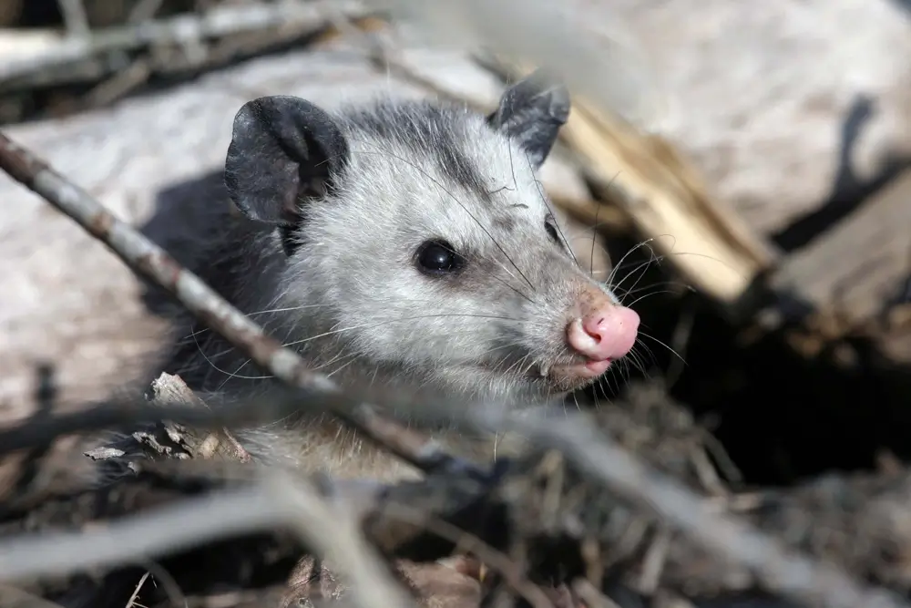 The opossum doesn’t hibernate in the winter, but it often holes up during very cold weather because it runs the risk of getting frostbite on its hairless ears, tail, and toes.