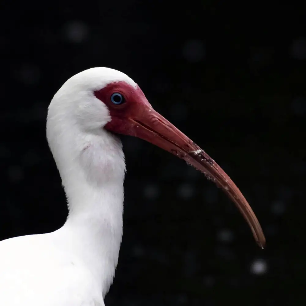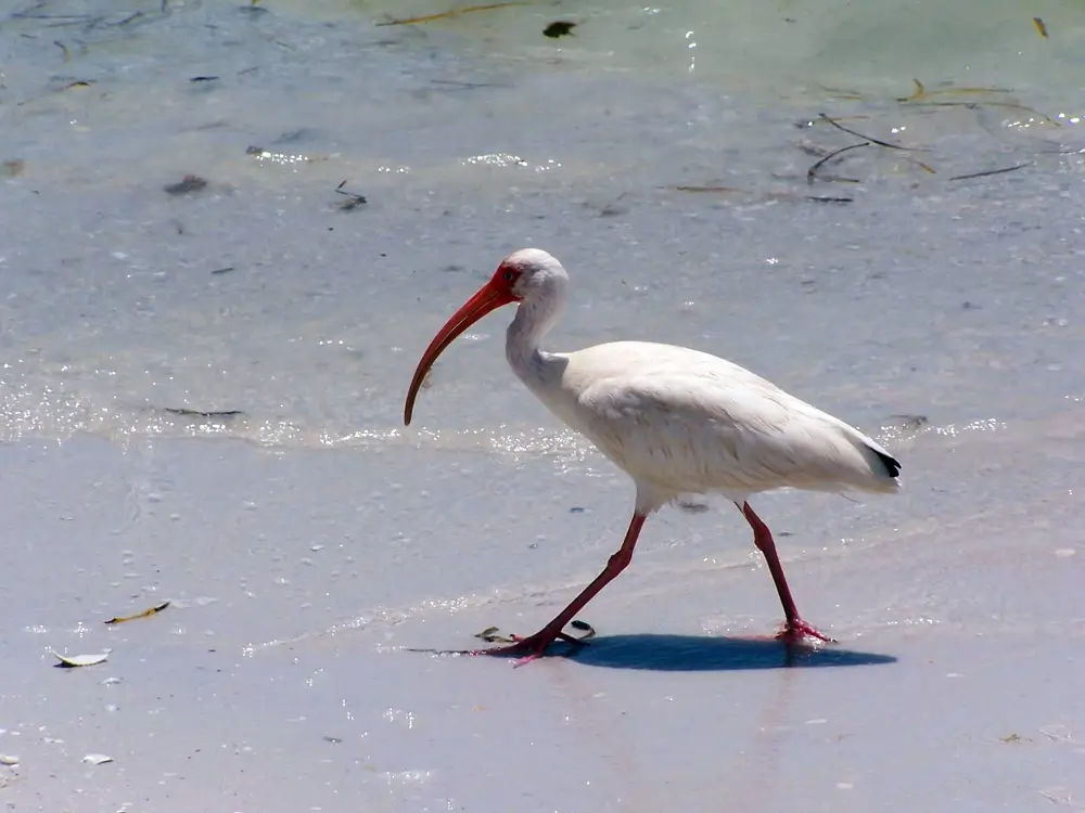 The white ibis wades in the water, sweeping its head from side to side in search of food. It uses its long, curved bill to probe in the mud for crabs and crayfish. It swallows its prey whole.