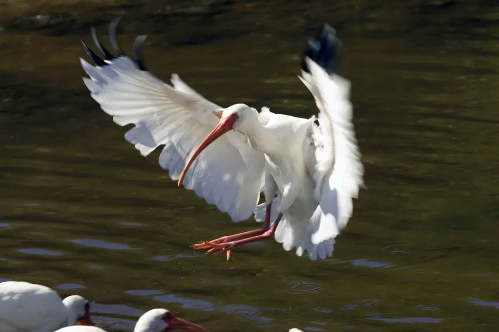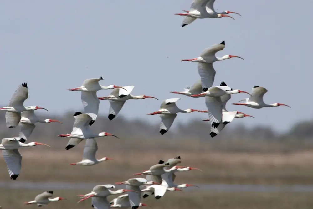 Flocks of white ibis move to different locations in search of food. Other wading birds often follow behind the white ibis and catch prey that has been disturbed by the probing ibis.