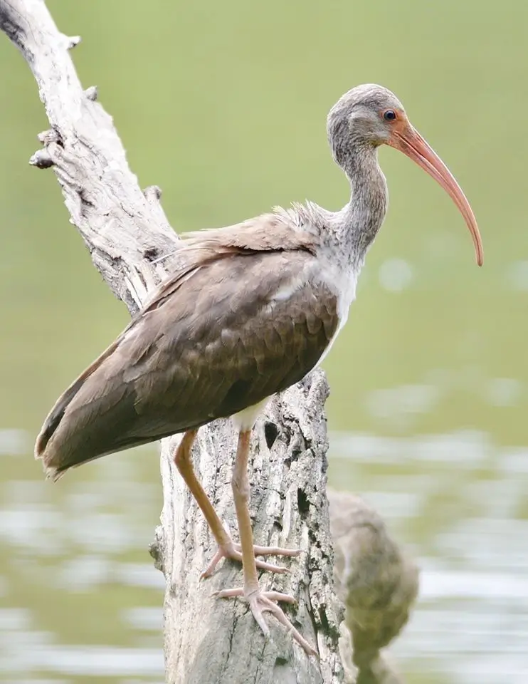 It has a long, down-curved, reddish-orange bill and a reddish-orange face. Its legs are long and gray, except during the breeding season when they turn reddish-orange.