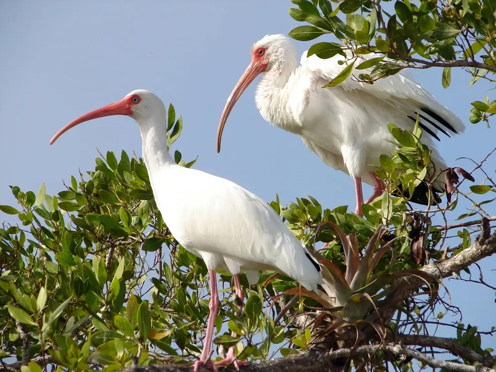 The white ibis breeds in large colonies that often include other wading birds. Males arrive at the breeding grounds first. The male preens and points its bill towards the sky to attract a mate.