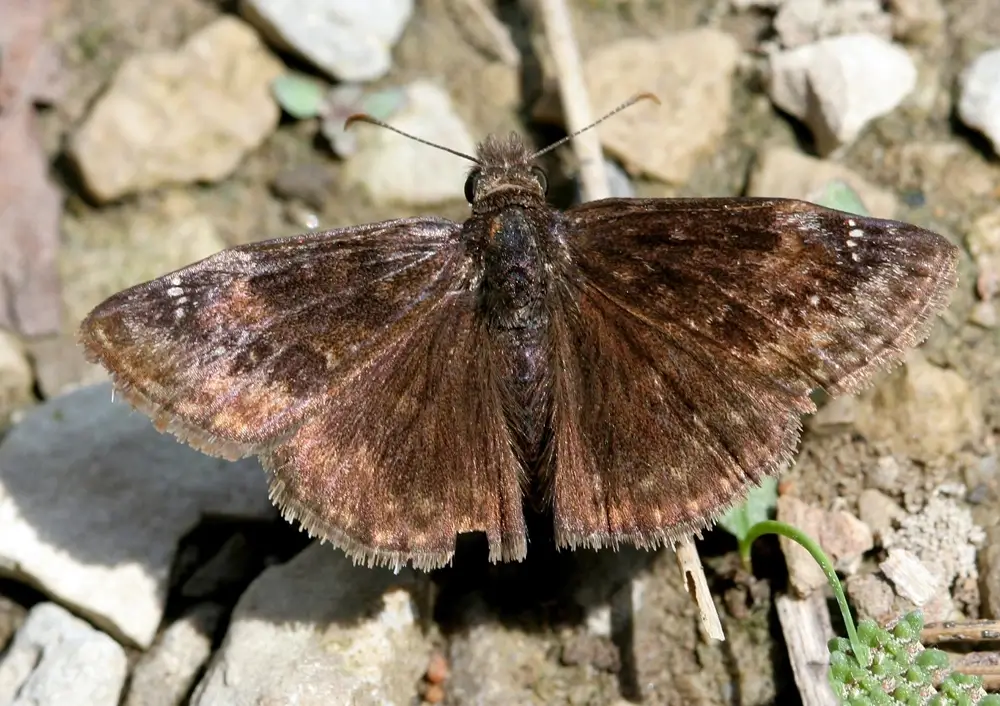 The wild indigo duskywing has a wingspan of a little over an inch (2.5 cm). Its wings are chocolate brown with some semi-transparent white patches and spots.