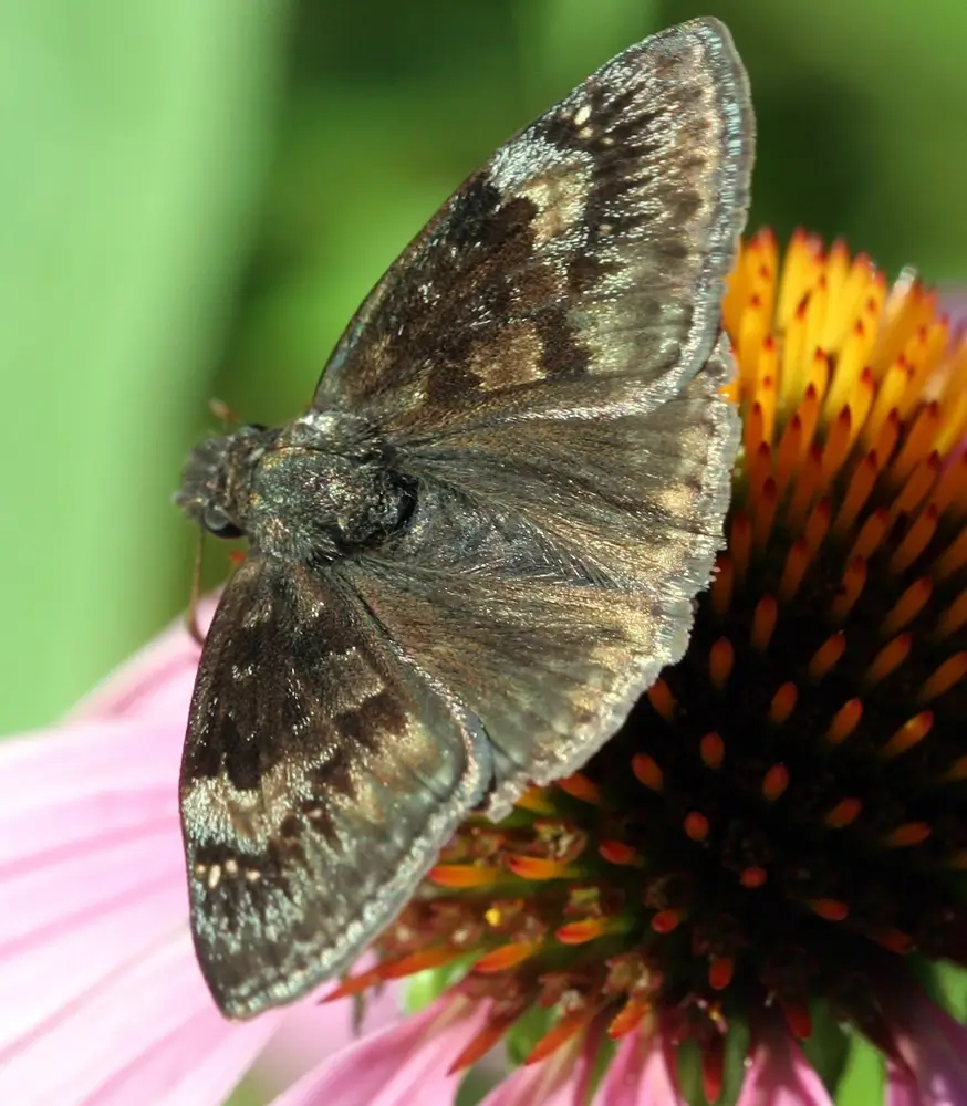 The wild indigo duskywing caterpillar eats wild indigo and crown vetch. The adult eats nectar from the flowers of blackberry, clover, black-eyed Susan, wild strawberry, and dogbane.