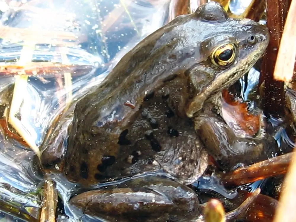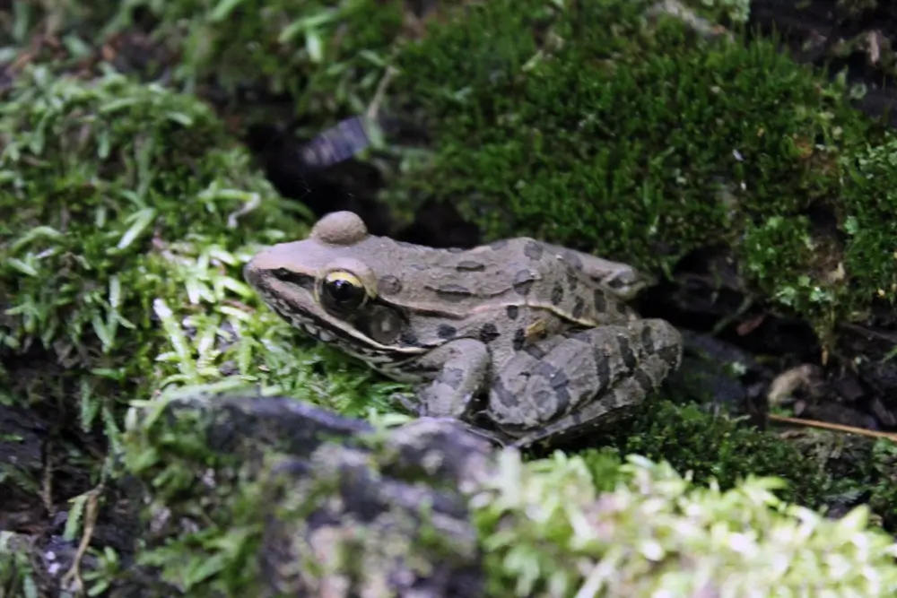 In the winter, wood frogs hibernate under logs, stumps, or leaf litter. Their bodies freeze in the winter, and their heart and breathing stop. As much as 65% of the water in the wood frog’s body turns to ice. When spring comes around, the wood frog thaws out and hops over to a breeding pond.
