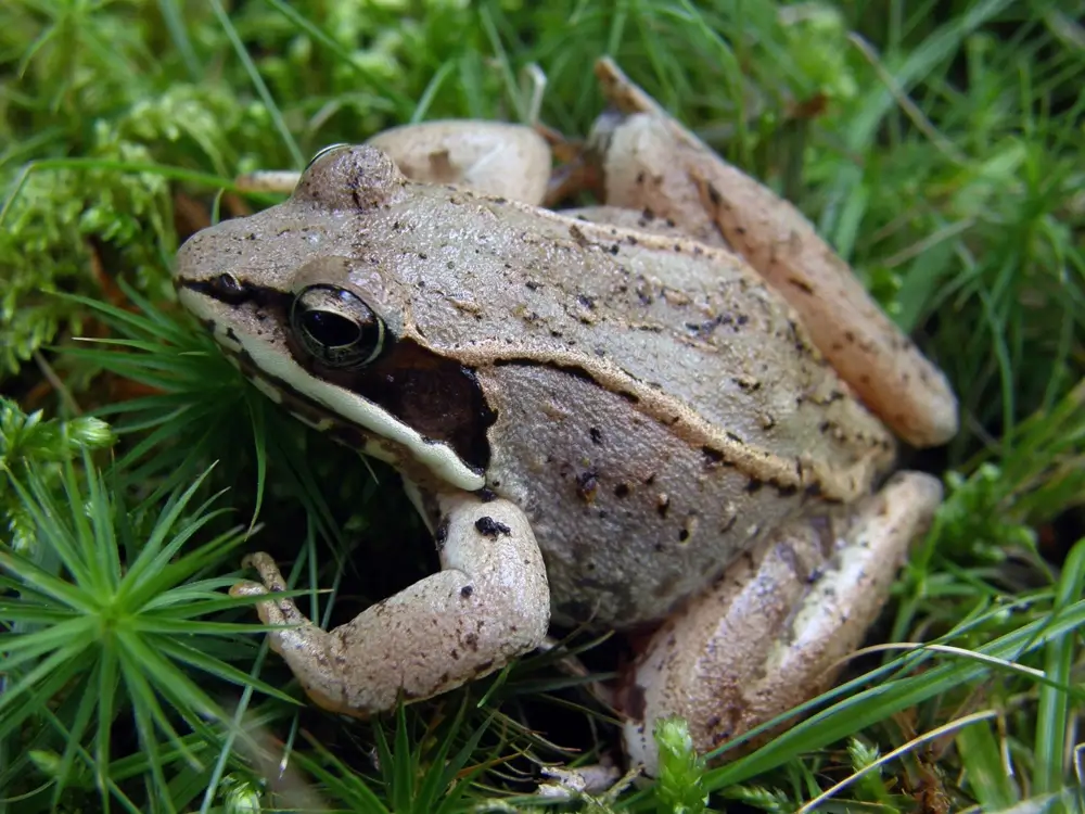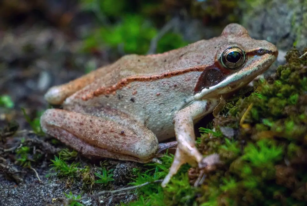 The wood frog is around 3 inches (7.6 cm) in length. It is brown, rusty red, gray, or tan, and it has bumpy skin. Its most recognizable feature is the black mask on its face, which is often called a “robber’s mask.”