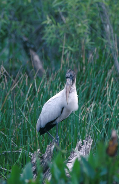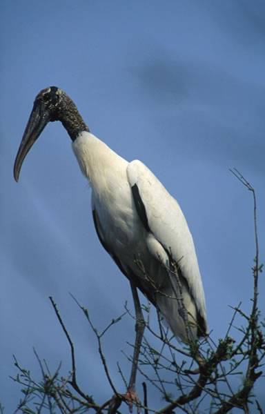The wood stork is the only stork species found in North America. It is 40-44 inches in length with a wingspan of five feet. It has a naked gray to black head and neck, a white body and black edged wings and tail. It has a long, slightly curved black bill and long legs. Unlike herons, the wood stork flies with its neck stretched straight out. Males and females look alike.