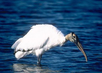 The wood stork feeds during the day and at night. It eats small fish, frogs, mollusks, snails, insects, and aquatic invertebrates. It hunts for its prey in shallow, muddy-bottomed banks or wetlands. The wood stork moves slowly through the shallow water with its bill open feeling for movement. When the wood stork locates a fish, it quickly snaps its bill shut.