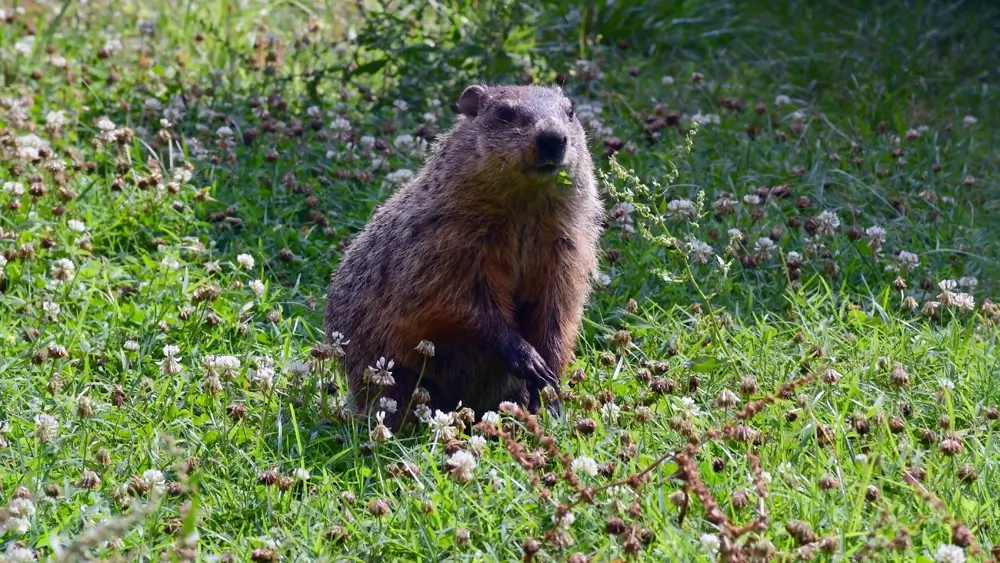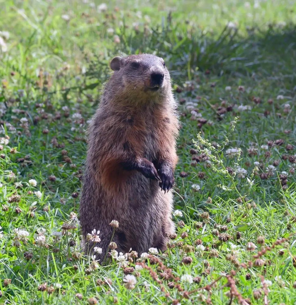 When the woodchuck is eating, it often looks up to check for predators. Its burrow is usually very close to where it feeds, so it can scurry back to safety if it spots a predator. When it is outside but not feeding, it will stand on its hind legs and keep a lookout for predators.