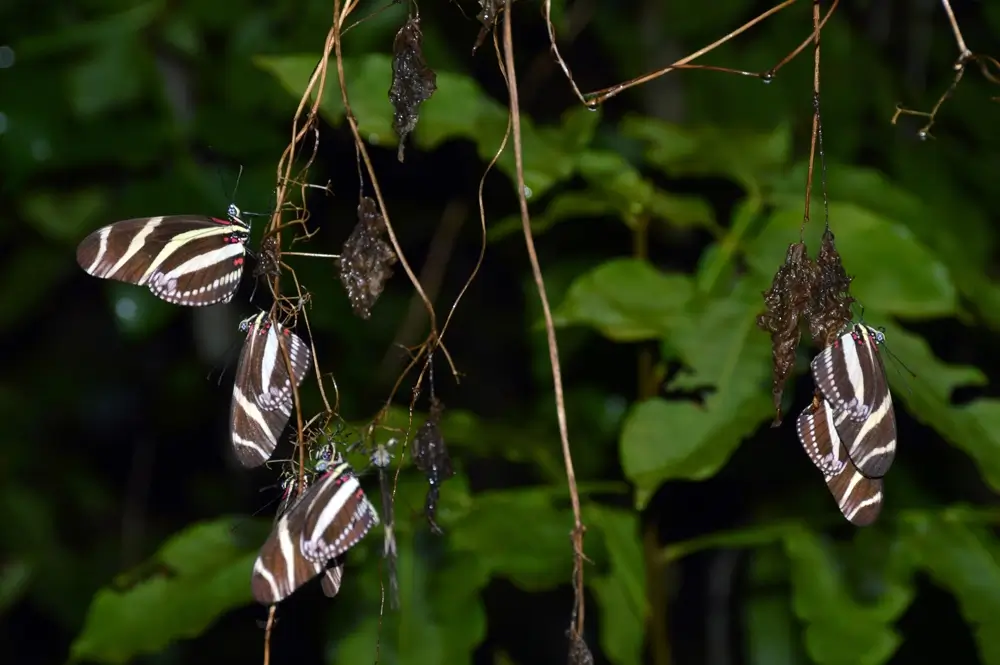 When it is disturbed, the zebra longwing butterfly makes a creaking sound by wiggling its body. At night, large groups roost together on tree limbs. They return to the same roost night after night.