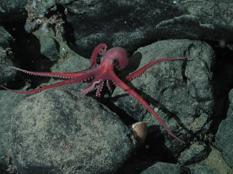 Octopus are mollusks like squid. There are about 200 species of octopus. There are two large groups of octopus. The cirrata or finned octopuses live in the deep sea at depths of between 1000 and 24,000 feet. About 85% of octopus are in the incirrata group. They have no fins and live in shallow water in caves or crevices.