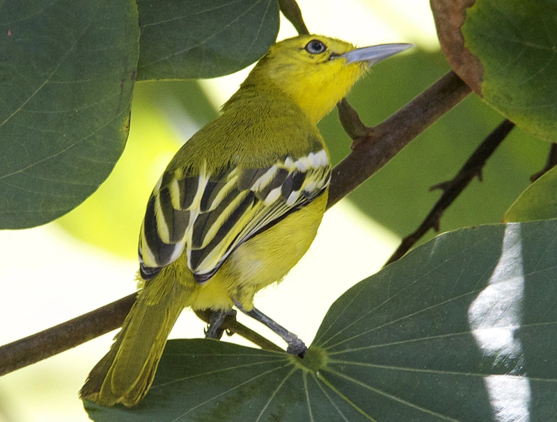 Ioras are yellow or green in color and are 4-6 inches in length. Males are usually larger than females. Two species, the common iora and the green iora, have black wings with white bars.