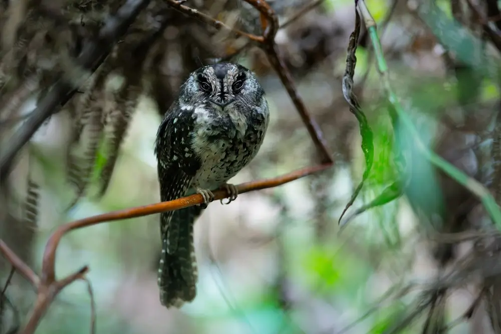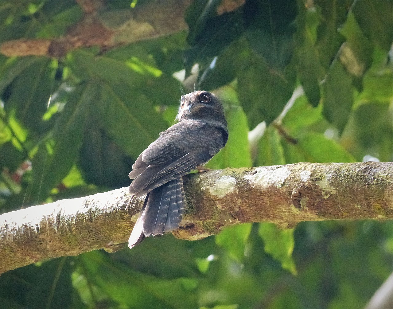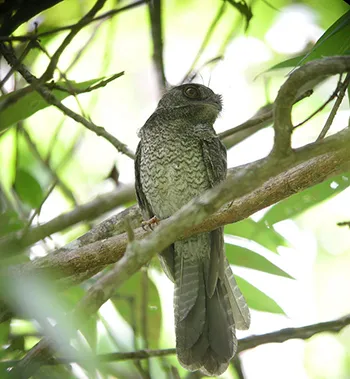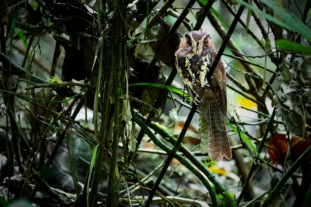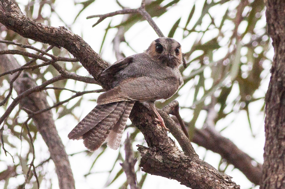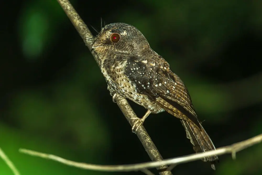 They have soft plumage that is a mixture of black, brown, gray, and white. Their plumage looks like the bark of a tree and helps camouflage them during the day. Owlet-nightjars have large, round eyes and small feet.