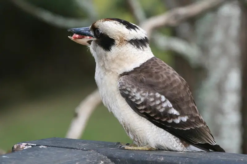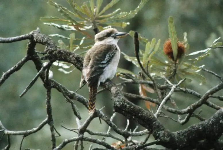 The laughing kookaburra of Australia is the largest species of kingfisher. It is about 16 inches in length and has a distinctive cackling, laughing call. It has brownish wings and face and a white belly. Laughing kookaburras live in woodland areas.