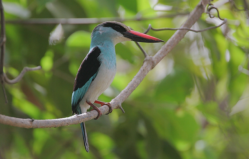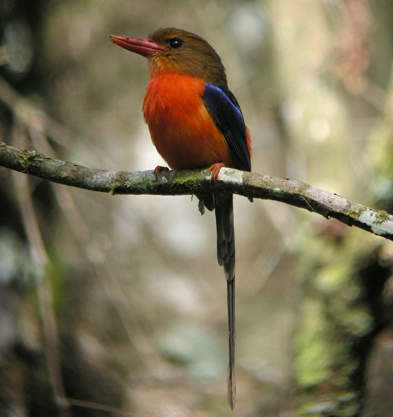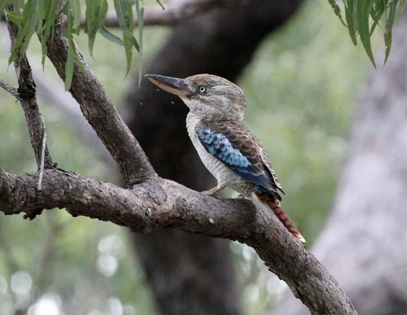 There are three other species of kookaburras. The blue-winged kookaburra is found in Australia and New Guinea. It is a little smaller than the laughing kookaburra and is brown with blue-edged wings. The rufous-bellied kookaburra is found in the rainforests of New Guinea. It has a white bill, a reddish belly and tail, and bluish wings. The spangled kookaburra is found on the Aru Islands and New Guinea. It has a white chest and belly, bright blue wings and tail, and a black head with white spots.