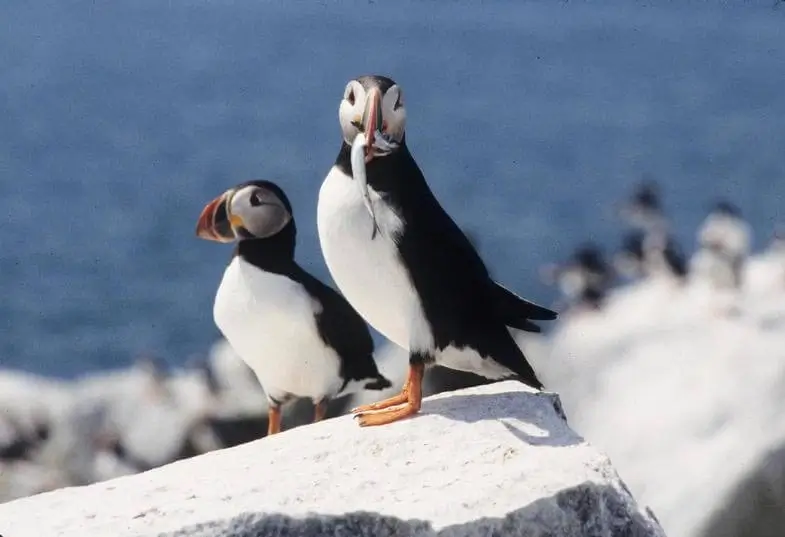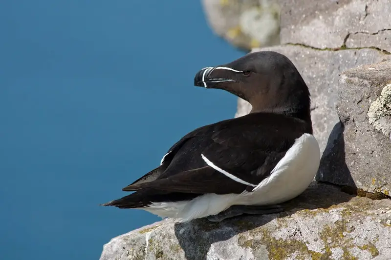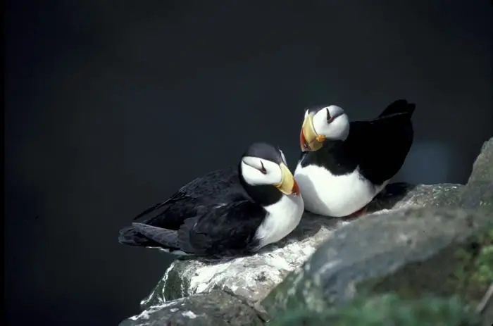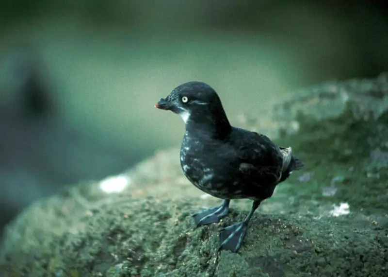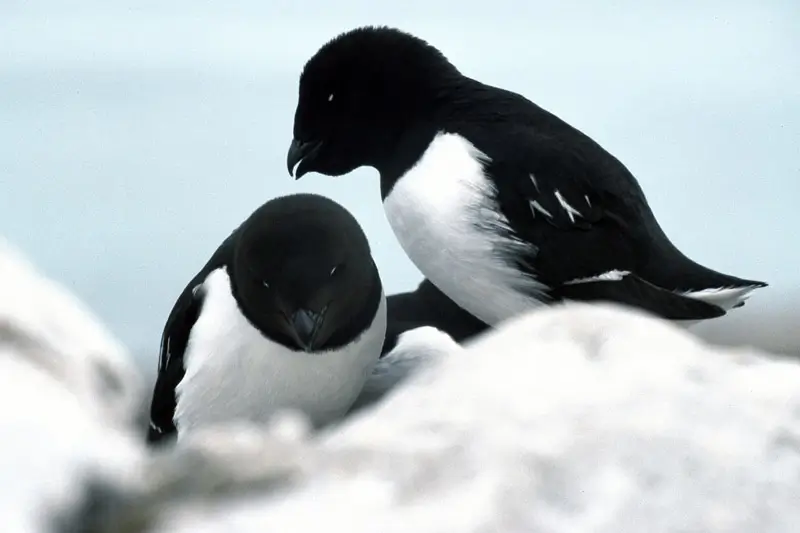 The great auk was a little over two feet tall. It was black with a white belly, and it had an oval white patch over its eyes. The great auk was hunted for food and fish bait, and for its feathers. The last known pair was killed by collectors in Iceland in 1844.