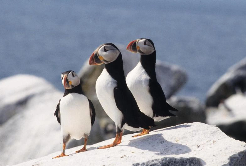 Auks, murres, and puffins have short wings and webbed feet. They live on the open ocean, except during the breeding season. Species in this family are found in the Northern Hemisphere in areas with cold water.