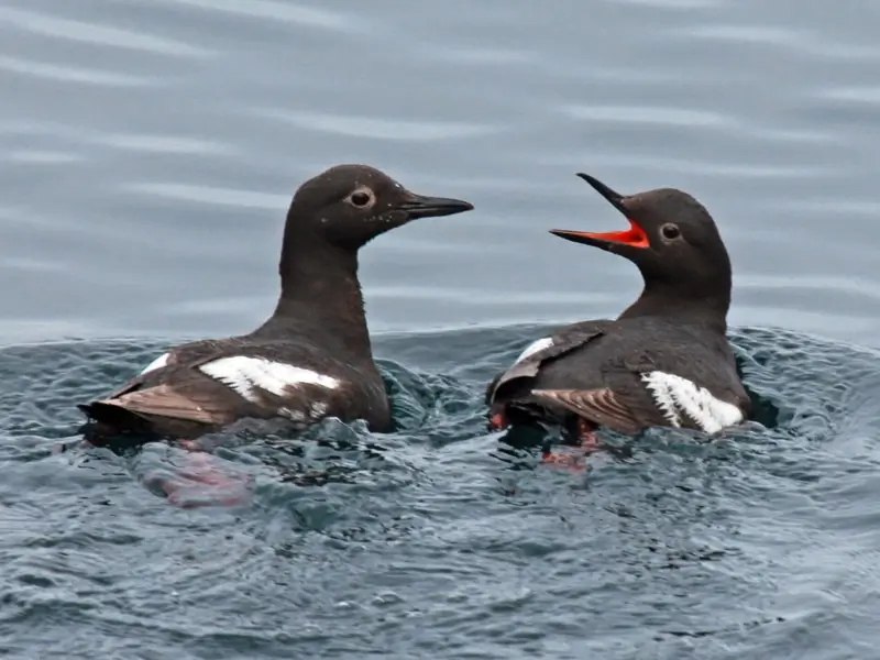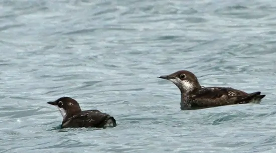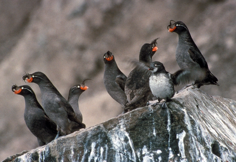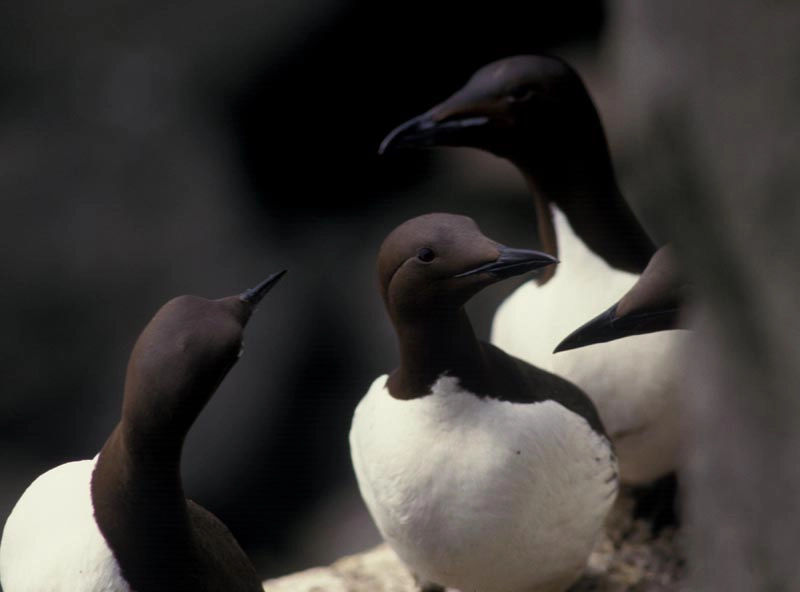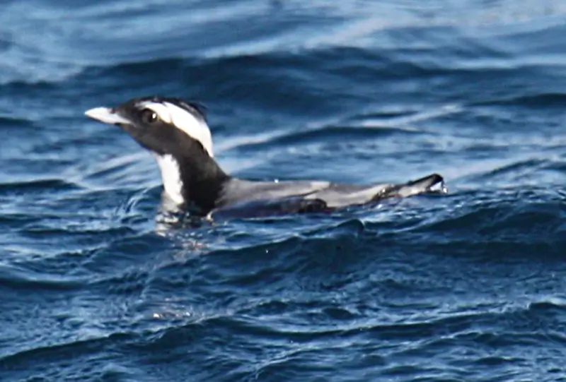 The Alcidae family includes the auks, puffins, and murres. The birds in this family look a lot like penguins. They are black and white and stand upright. Like penguins, they are very good swimmers and divers, but unlike penguins, they can fly.