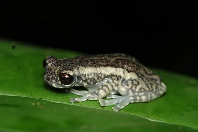 The Tukeit Hill frog is tiny – only an inch in length. It can vary in color from black with yellow spots and stripes to yellow with black spots and stripes.