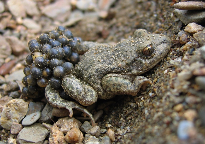 The male midwife toad attaches fertilized eggs to his legs and back and carries them around for up to a month. He has to keep the eggs moist, so access to water is important.