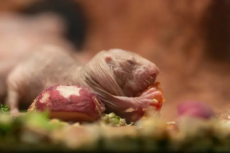 Mole rats live in burrows in the ground. They have long, cylinder-shaped bodies; short legs; and small eyes and ears. Most species have loose skin that makes it easy for them to move forward or backward in underground tunnels.