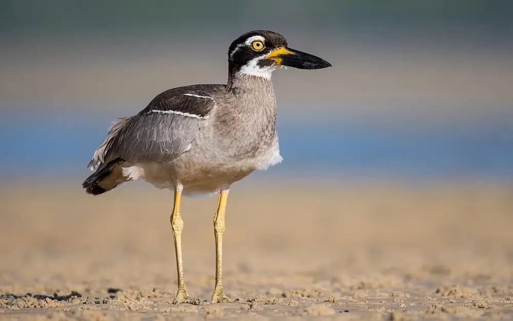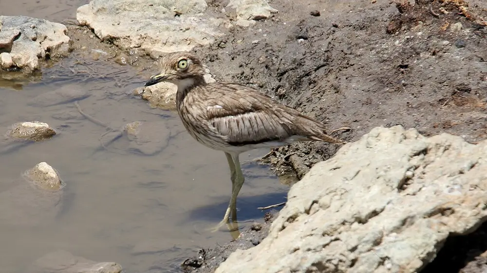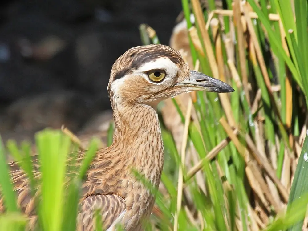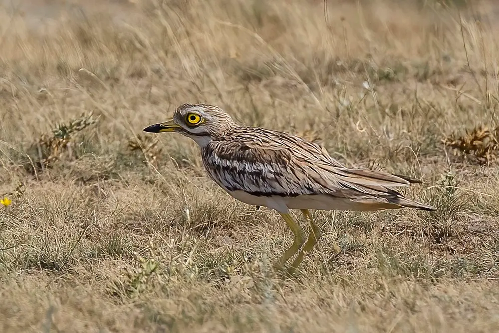 Thick-knees have long legs with large knee joints, strong yellow or black bills, and large, round yellow eyes. They are speckled sandy-brown with white undersides.