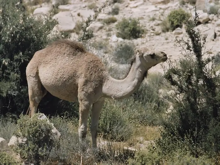 The dromedarian camel is found in the deserts in Africa and the Middle East. It has one hump that stores fat, not water.