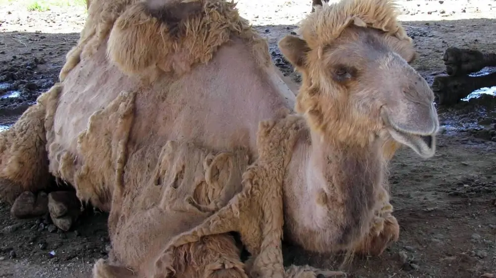 In the winter, it has a thick, shaggy coat that helps keep it warm. Its bushy eyebrows, long double rows of eyelashes, and nostrils and lips that close tightly help keep sand out of its eyes, nose, and mouth.