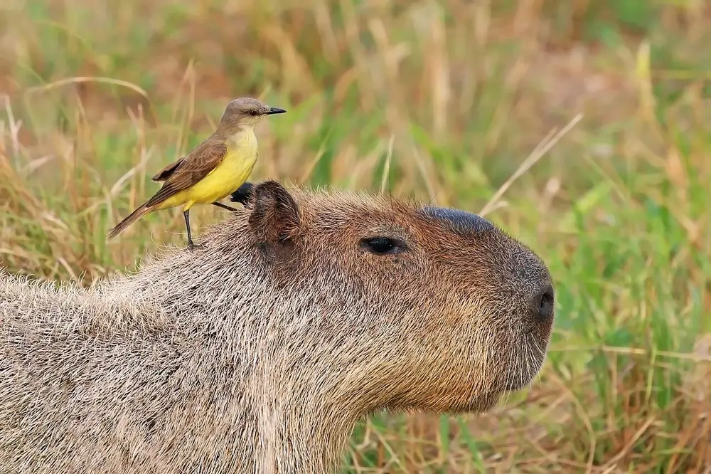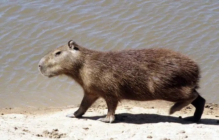 The capybara is found in South America and is the largest living rodent. They stand about 1.5 feet tall and are around 4 feet long, and weigh as much as 150 pounds. Capybaras have stocky bodies, reddish-brown fur, webbed toes with claws, and large heads with squared muzzles.