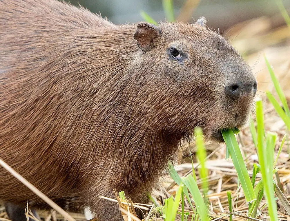 Capybaras are semi-aquatic and are found near lakes, ponds, swamps, rivers, and marshes. Capybaras can stay underwater for as long as five minutes! They are excellent swimmers. Their eyes and nose are on the top of their heads so they can keep them above the water. Capybaras are herbivores and eat grasses and aquatic plants. They are very social and live in groups of 10-40 individuals led by a male. Females have 4-7 babies at a time.