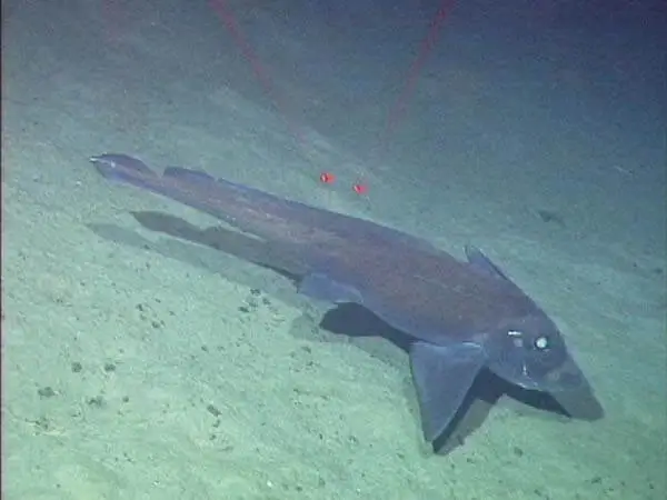 They have one pair of grinding tooth plates in their lower jaw and two pairs of grinding tooth plates in their upper jaw that stick out of their mouth like a rabbit’s teeth! They have thick bodies that taper to a long, thin rat-like tail. Males have three grasping organs. They have two graspers on their pelvis that they use when they are mating. They have one grasper with a hook on it on their heads that they use to catch a female. Female chimaeras have a dent in their heads that the hook fits into! Chimaeras have two dorsal fins. The first dorsal fin has a
