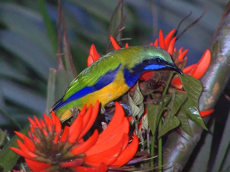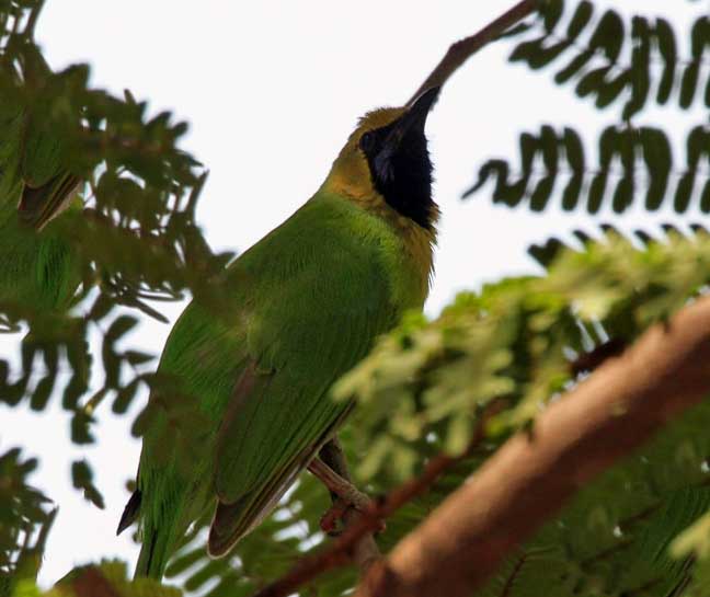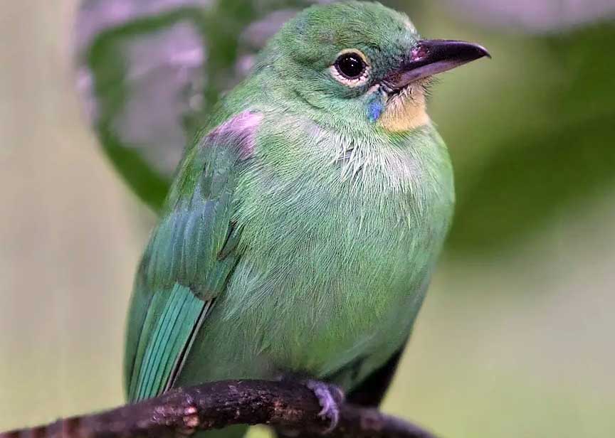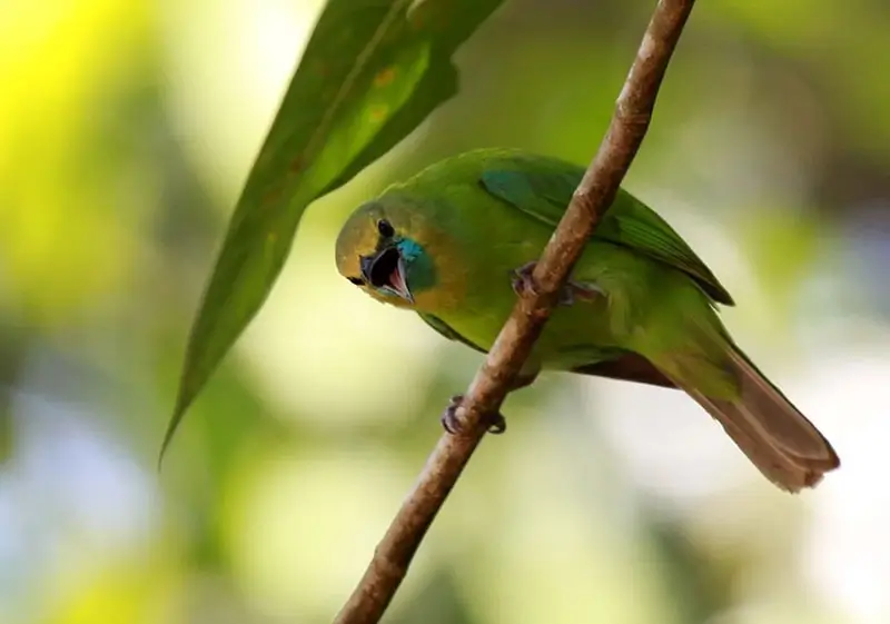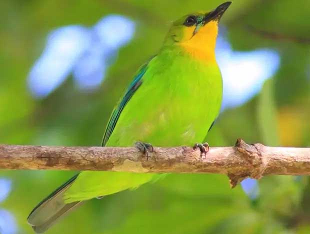 Males are brightly colored, usually yellow or green. Females are duller in color. Leafbirds have forked tongues and eat insects, fruit, and nectar.