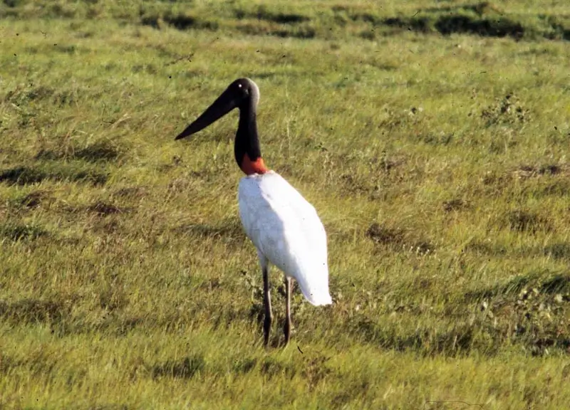 The jabiru is a stork found in Central and South America. It is the tallest flying bird found in the Americas. It can be up to five feet tall and have a wingspan of 7-9 feet. It has a white body and a featherless black head and upper neck, and a featherless red pouch at the base of its neck.