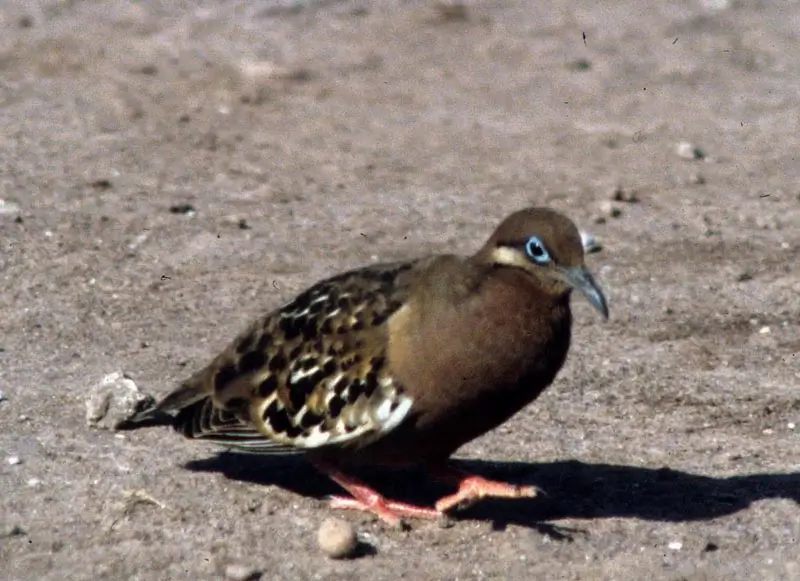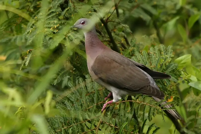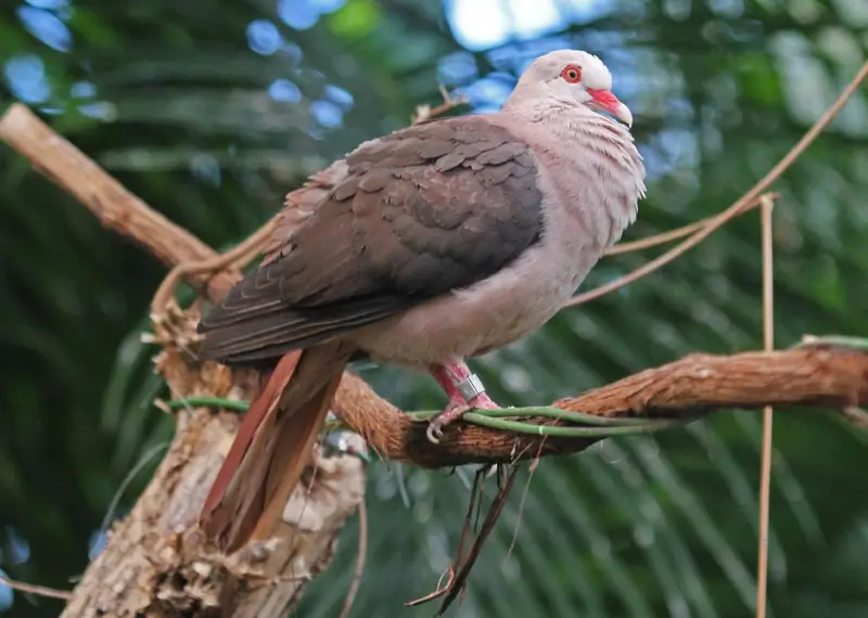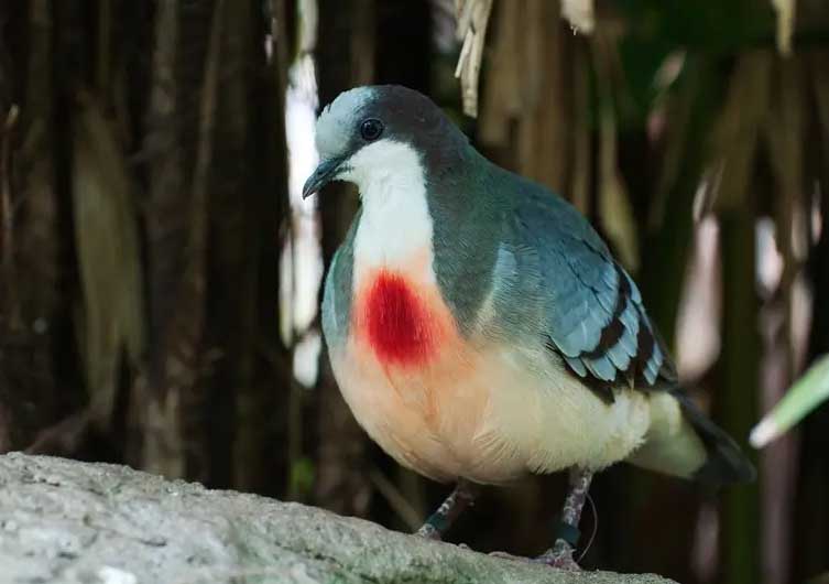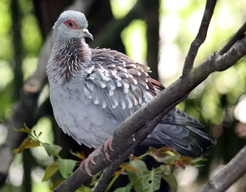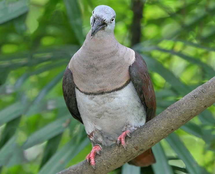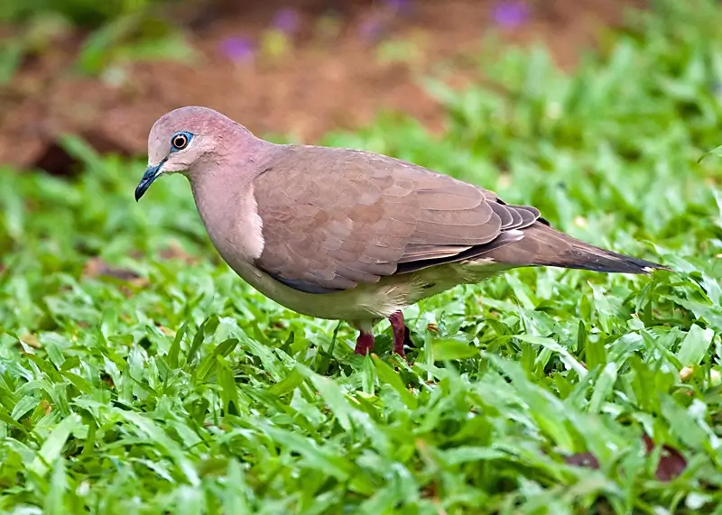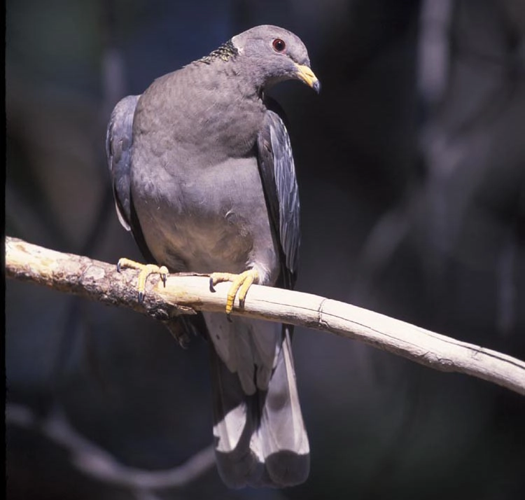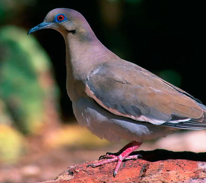 Pigeons and doves have small heads, plump bodies, short necks, and small bills with soft, fleshy covering at the base called the cere. They have a ring of skin around their eyes that can be red, yellow, blue, or white.