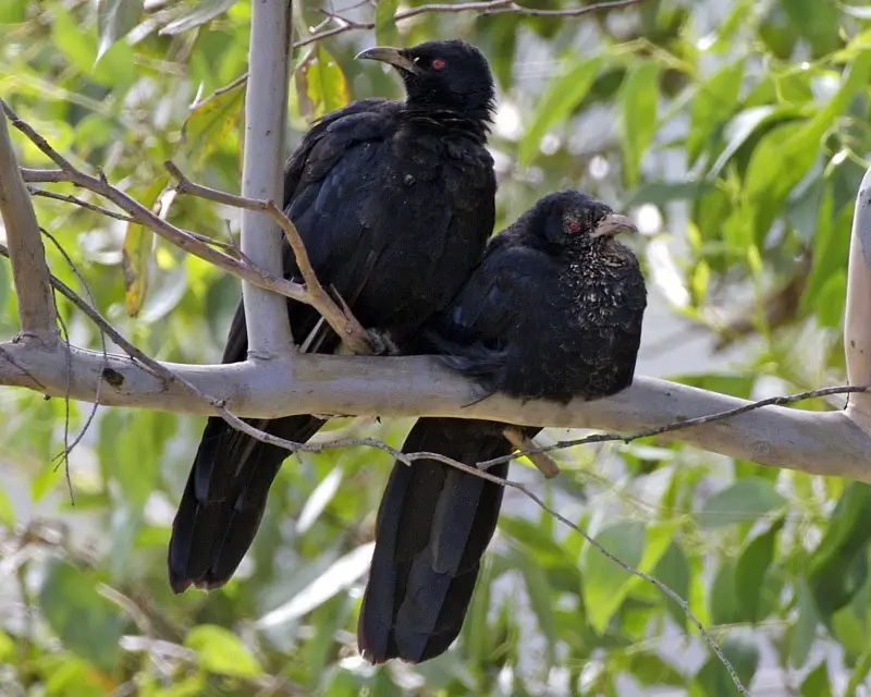The white-winged chough is a large, black, crow-like bird with red eyes, a curved bill, and large white patches on its wings that are visible when it is in flight.