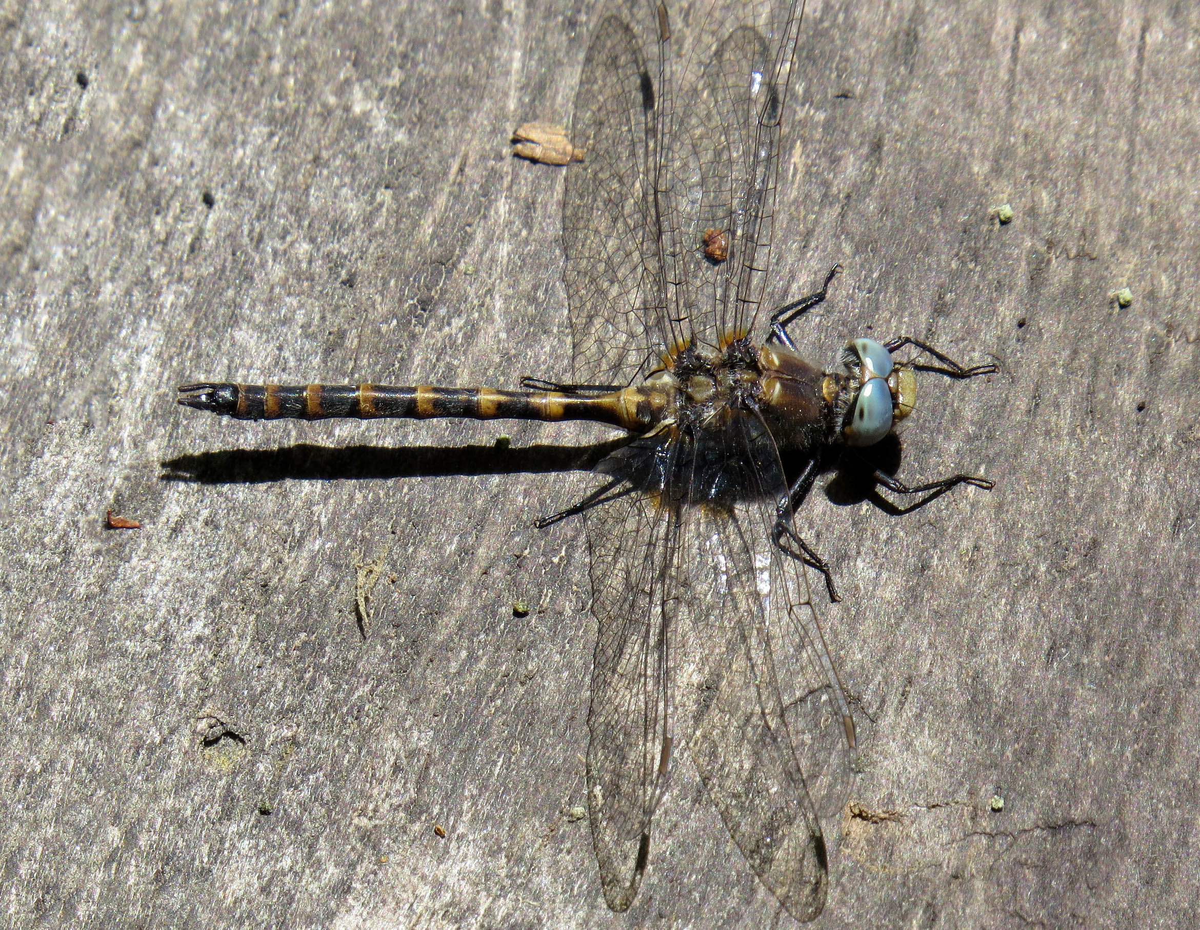 The ringed boghaunter is a little over an inch in length. It is black with yellow or orange rings on its abdomen. It has a yellow face and mouth and bright bluish-green eyes.