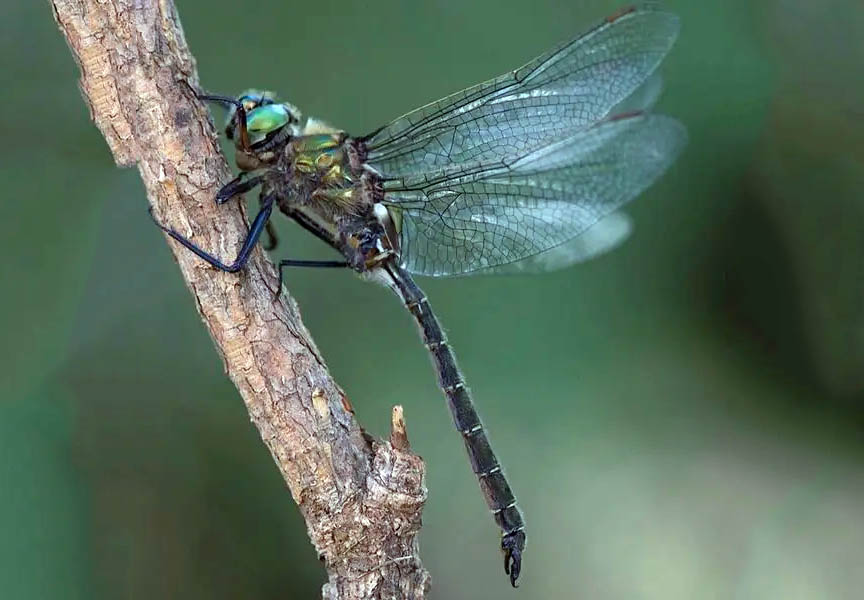 The dragonflies in this family are large, usually between 1.5 and 3 inches in length. They have bright green eyes, and many species are black with metallic green or yellow markings.