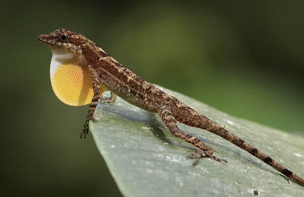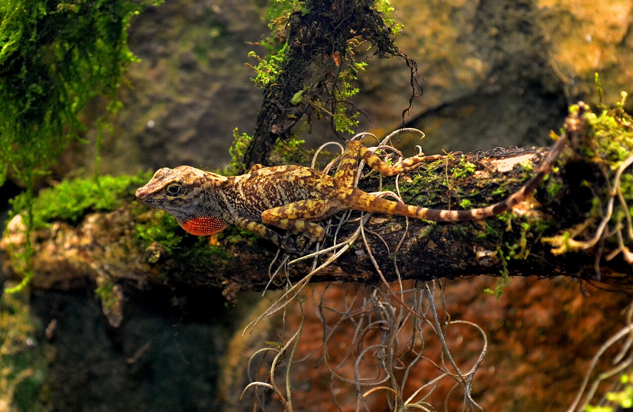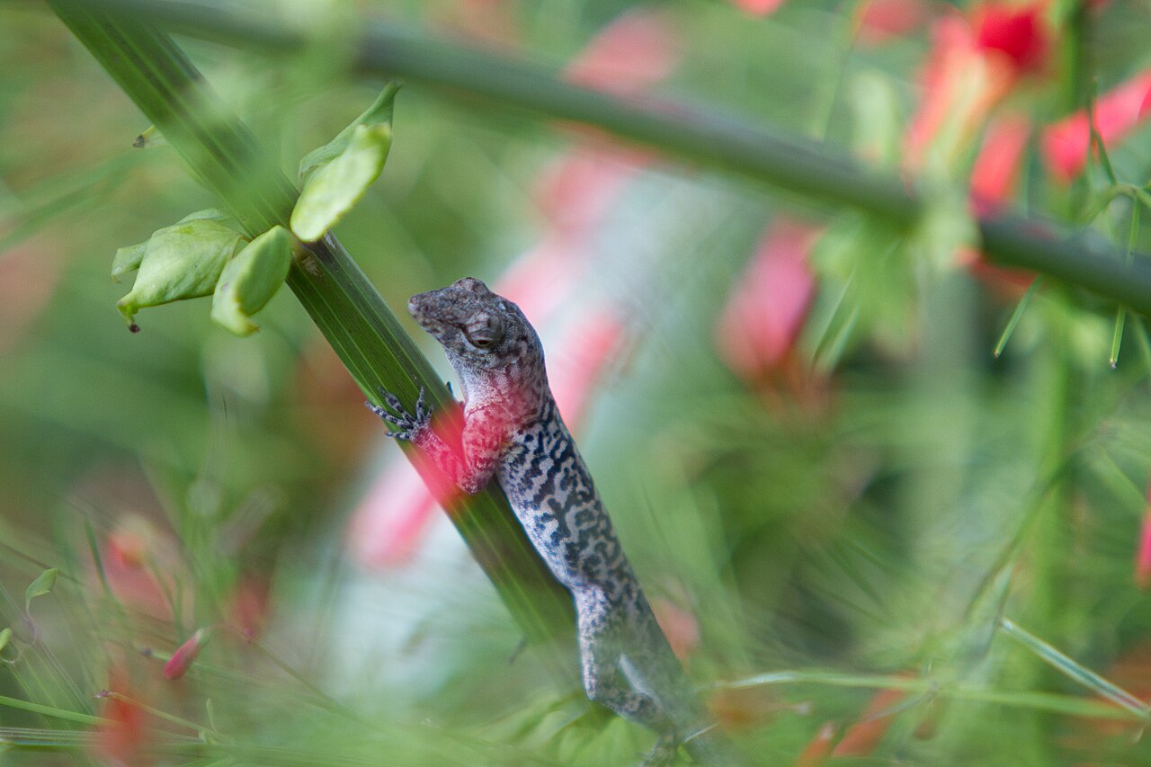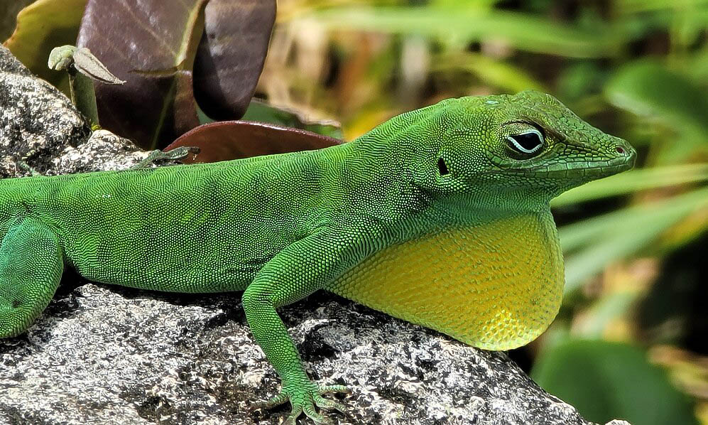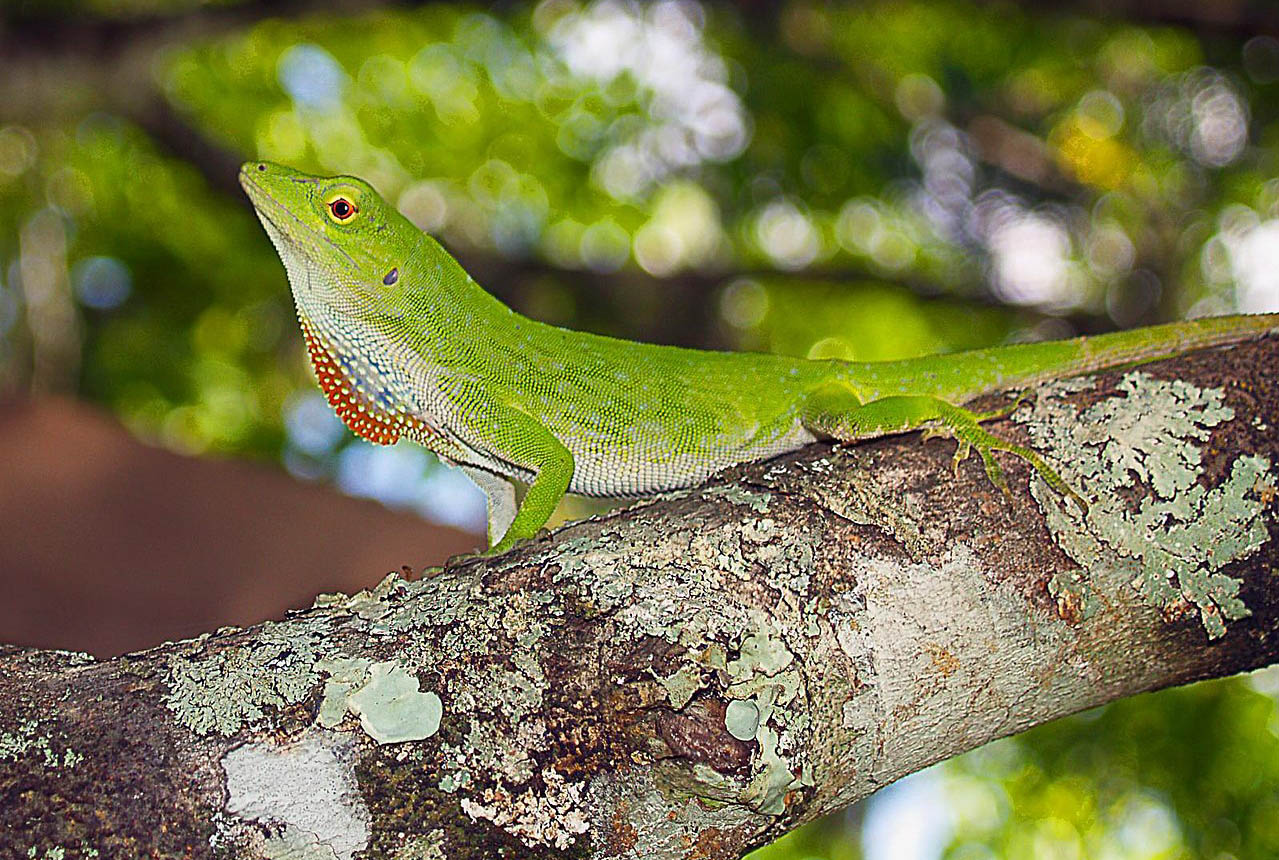 Male anoles have a colorful flap of skin under their necks, called a dewlap, which they use to show off or defend their territory.
