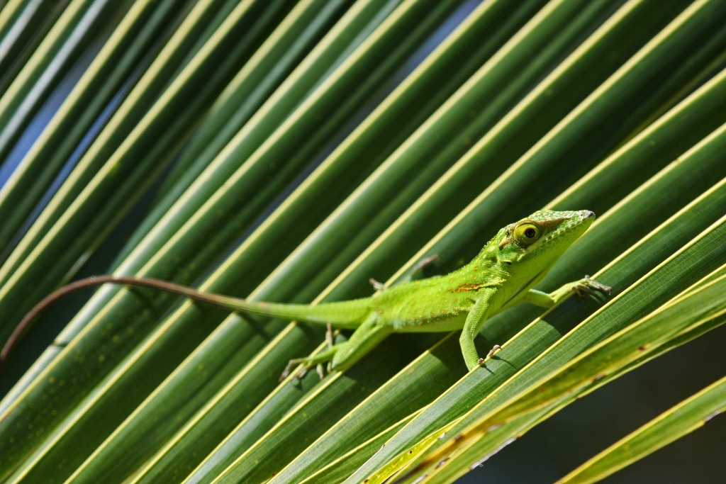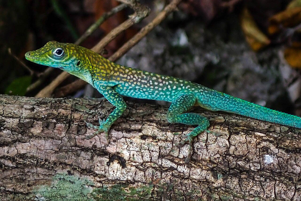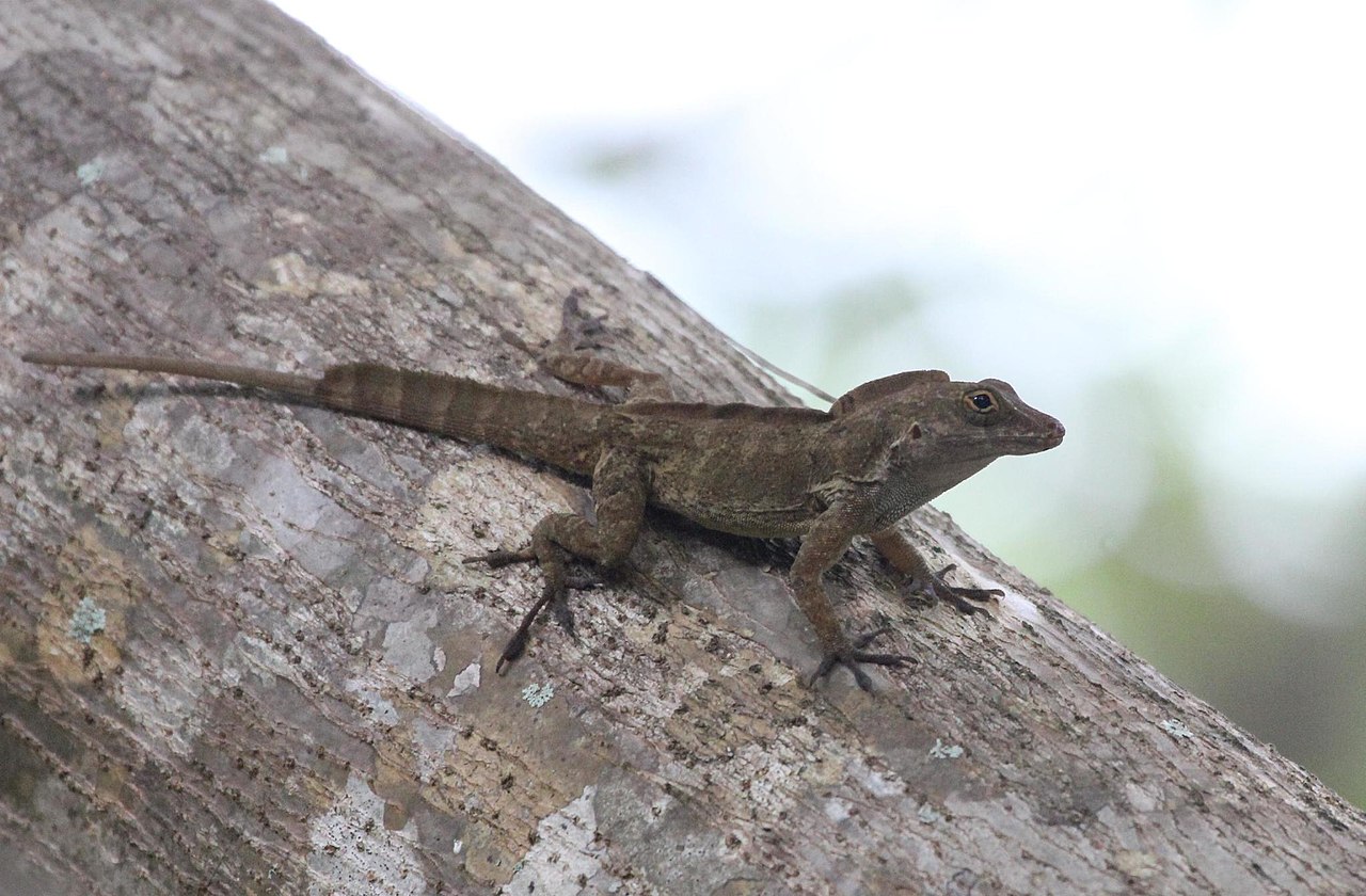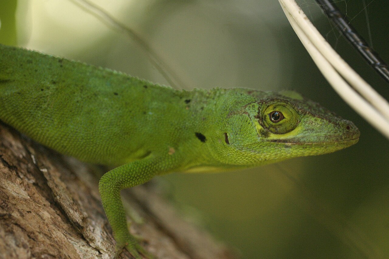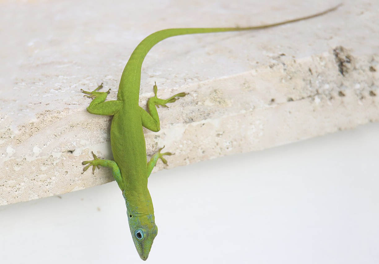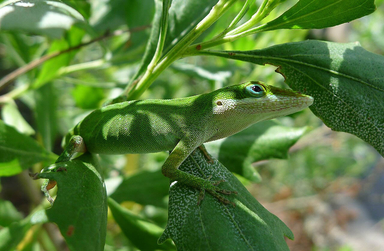 Many anoles can change color and have long tails and sticky toe pads that help them climb trees and walls.