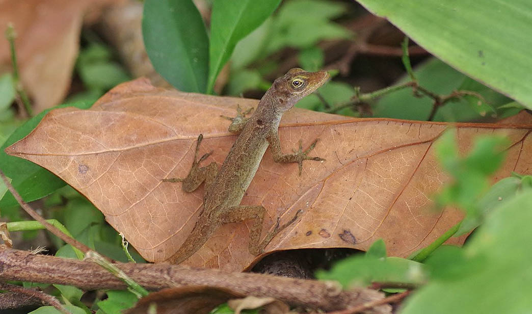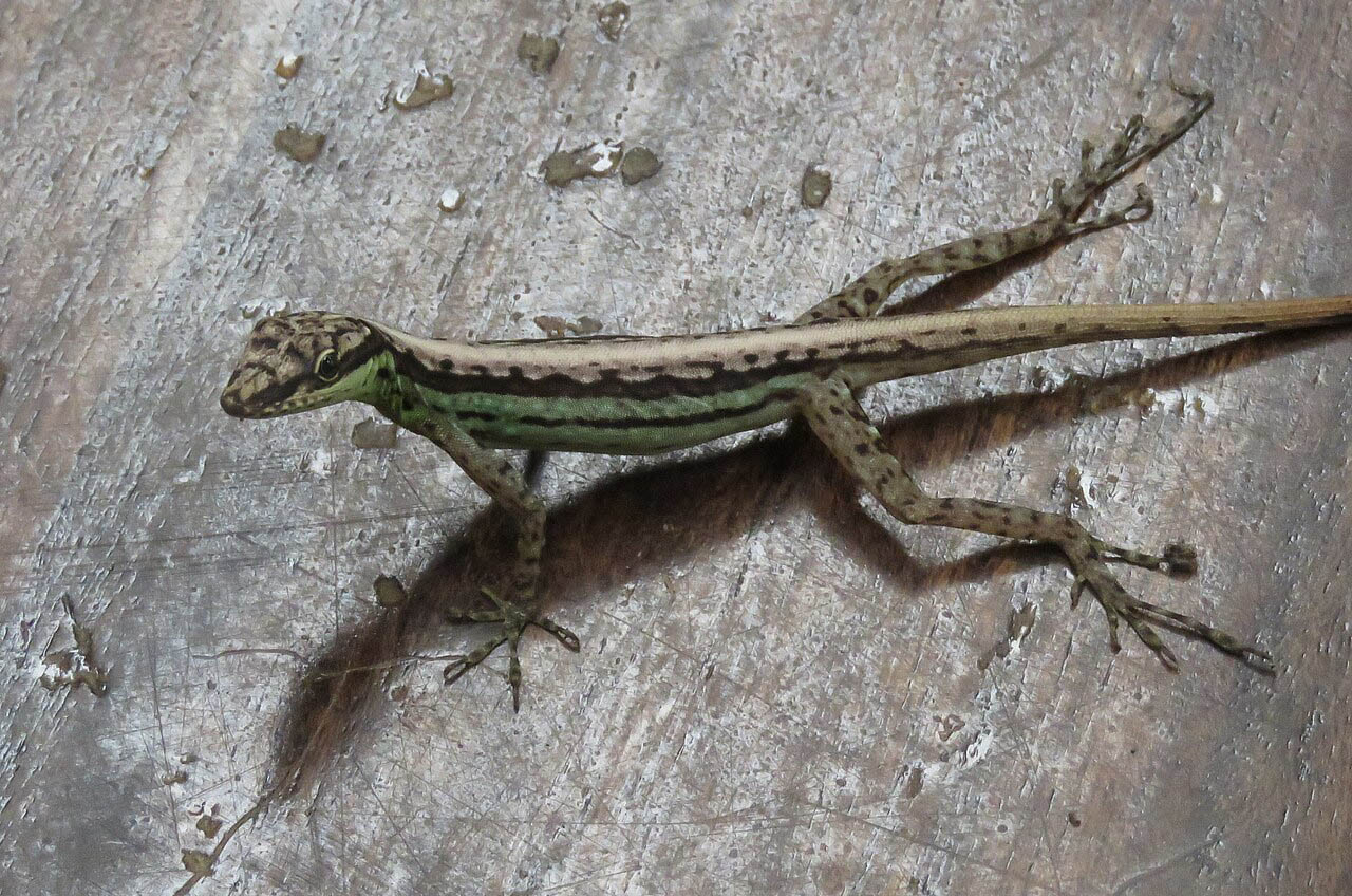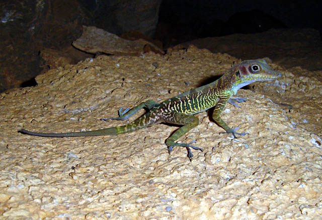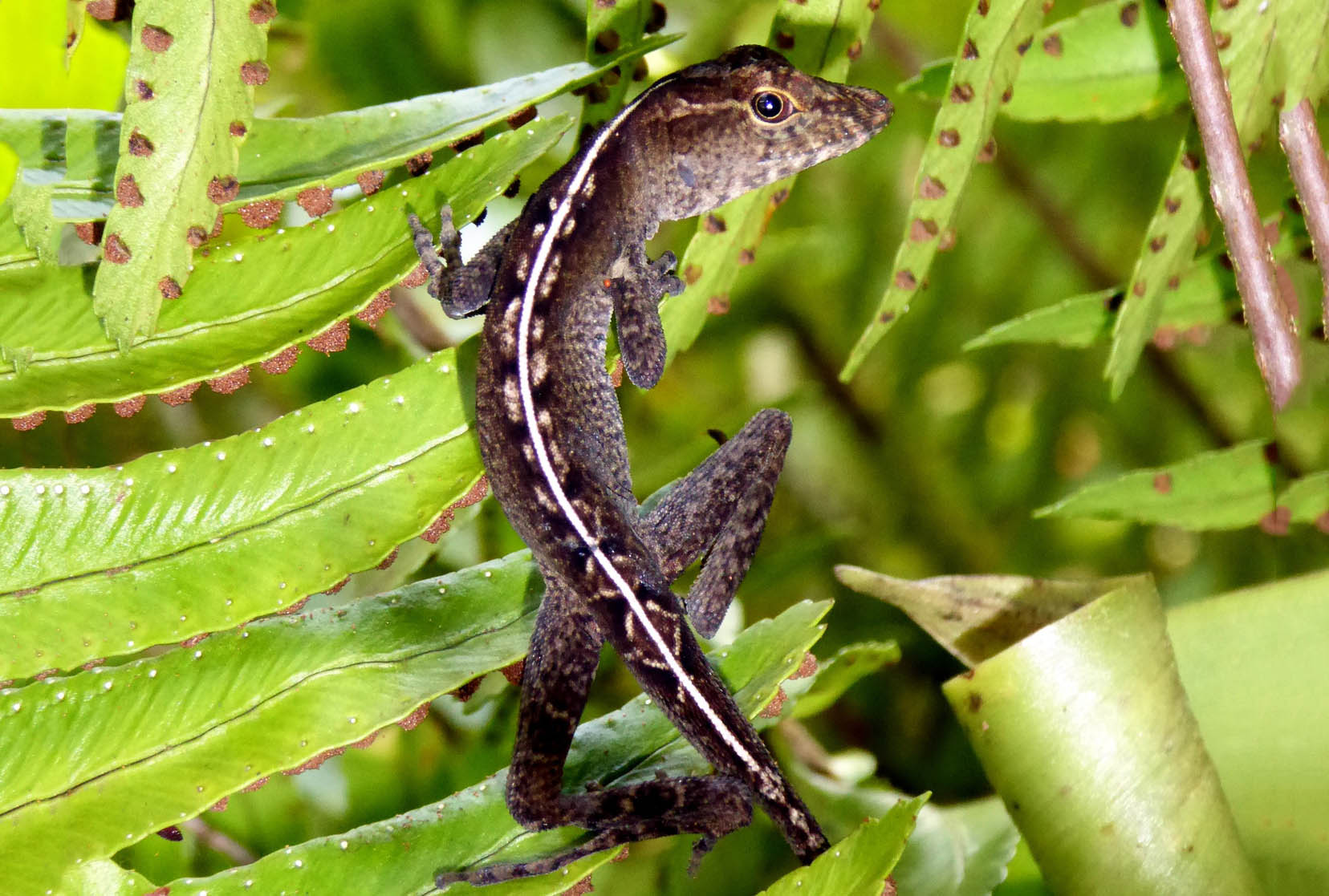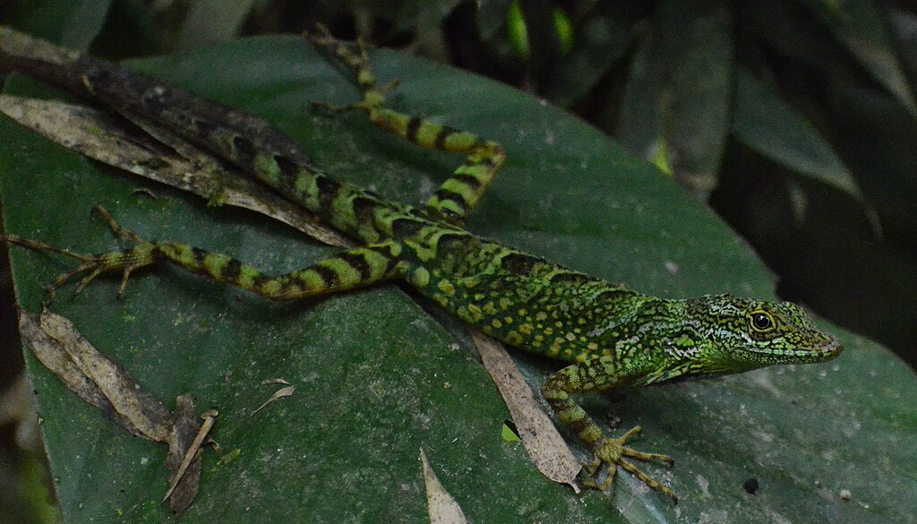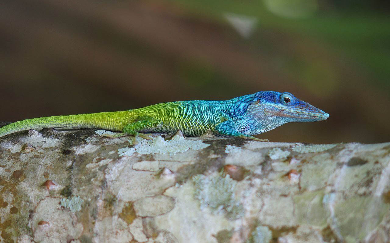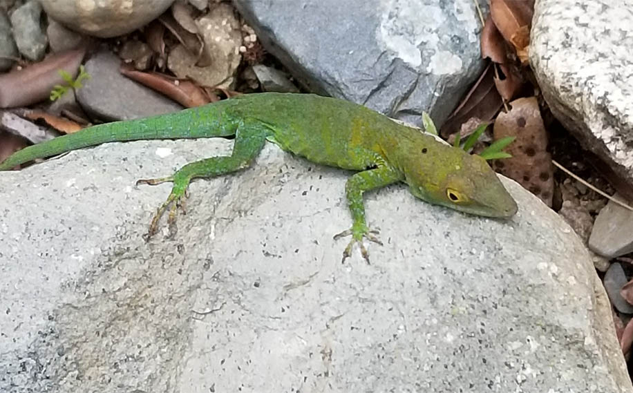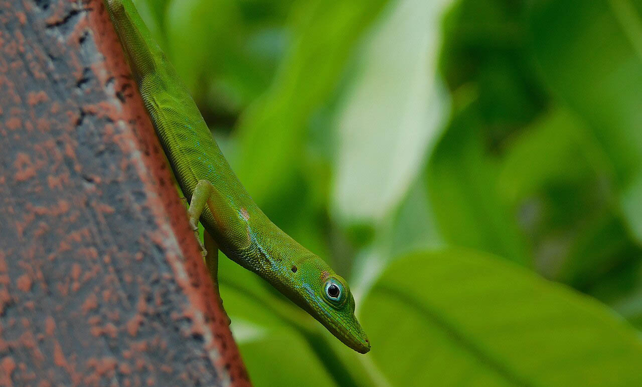 Many anoles can change color and have long tails and sticky toe pads that help them climb trees and walls.