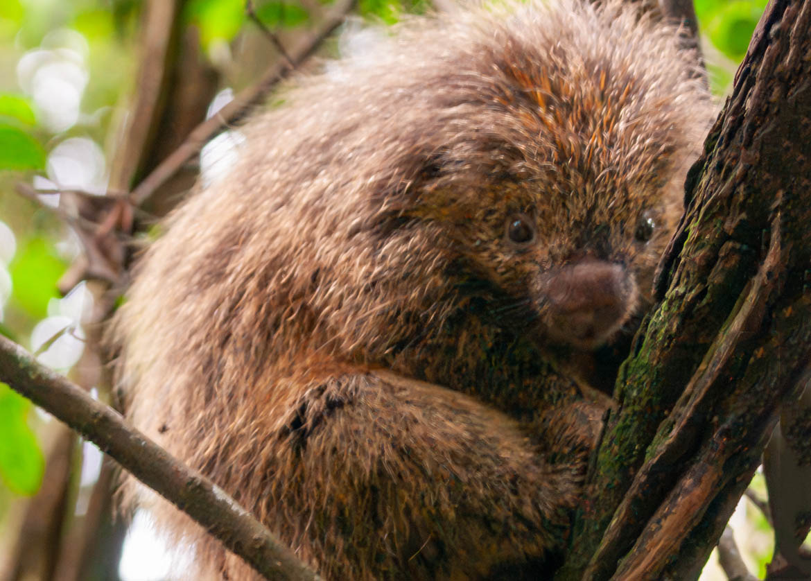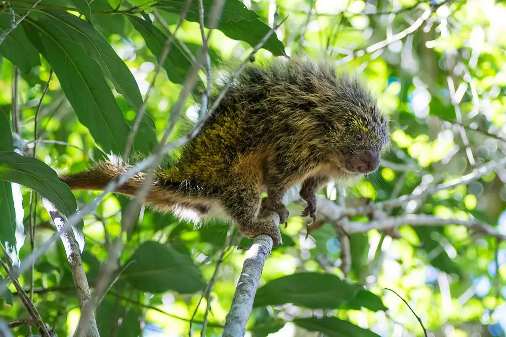 New World porcupines range in size from 17 to 32 inches in length. They have long, spiny, barbed hairs known as quills. Contrary to popular belief, porcupines do not shoot their quills. However, if a predator gets too close, the quills can become embedded in the attacker.