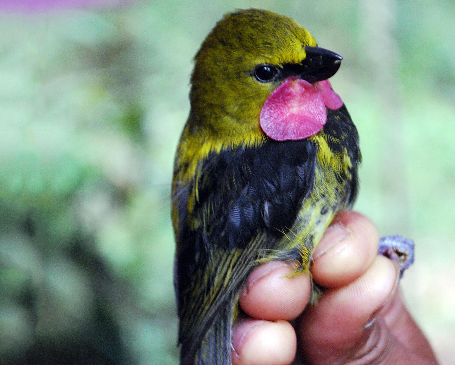 It’s small, with a stubby bill and colorful feathers. The male has a bright yellow face and a pink wattle (a fleshy flap of skin) near its bill.