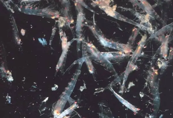 Krill are small, pinkish, translucent shrimp-like crustaceans. They range in size from less than an inch to five inches in length. Krill are found in all the world’s oceans.
