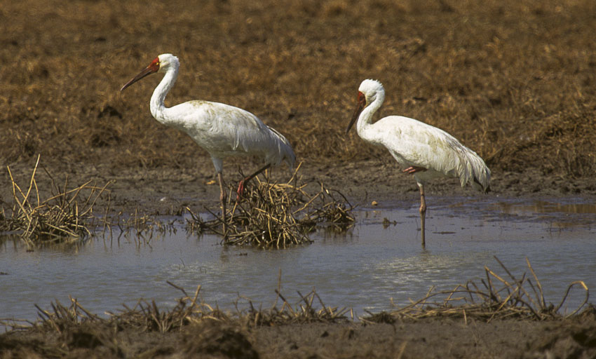 They are large birds with large, straight bills; long necks; and long legs. They are similar in appearance to herons and egrets, but unlike those species, they fly with their necks stretched straight out instead of tucked in.