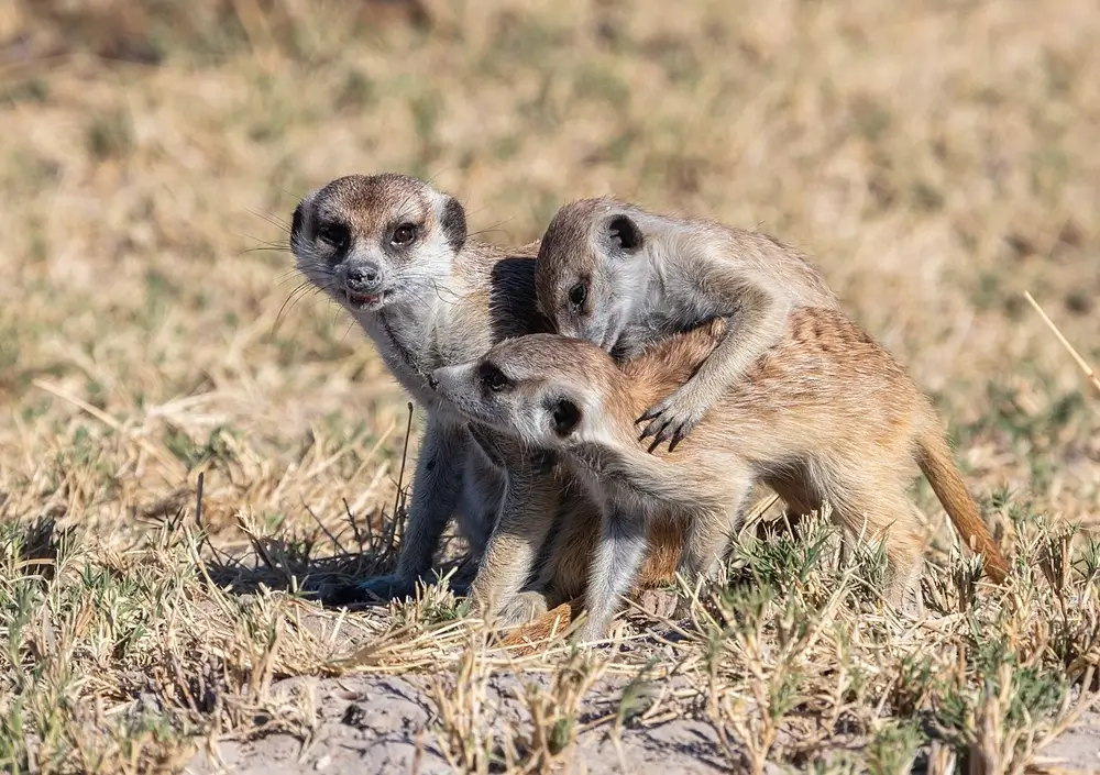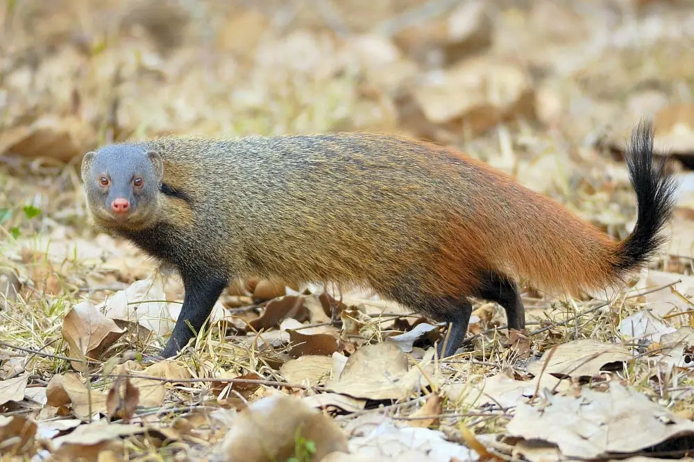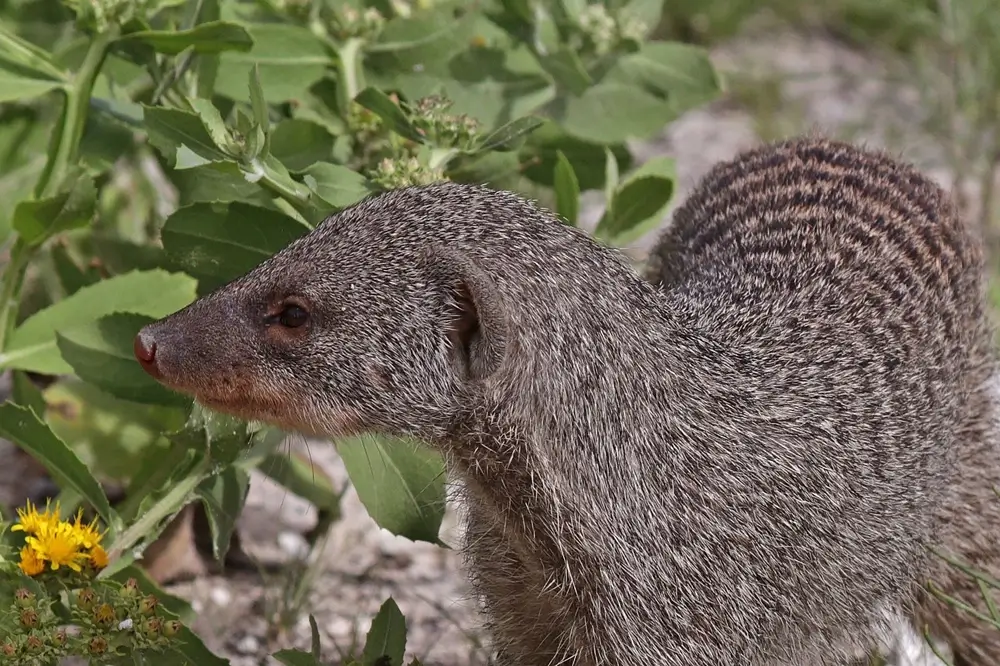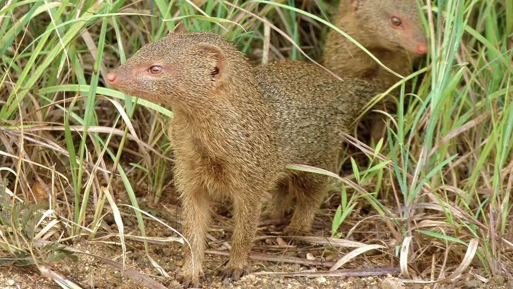 Mongooses have long bodies, small heads, pointed snouts, short, rounded ears, and long tails. Most species are gray or brown.