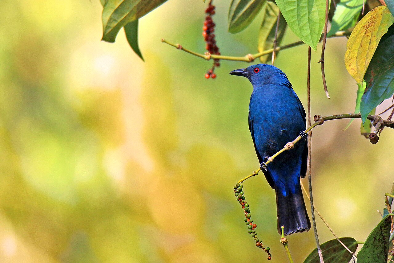 Fairy-bluebirds are the size of crows and have strong, curved bills. Males are a deep blue, and females are duller in color.